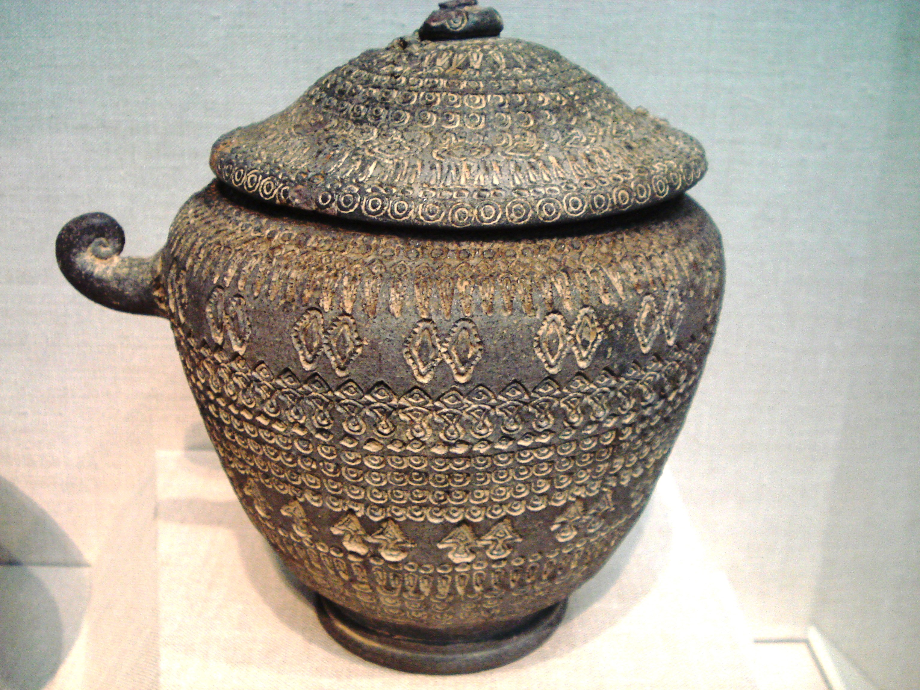 A ceramic funerary urn from the Unified Silla kingdom of ancient Korea. The decoration is typical of the period and was achieved using stamps. 8th century CE. (Freer and Sackler Galleries, Washington, D.C)
