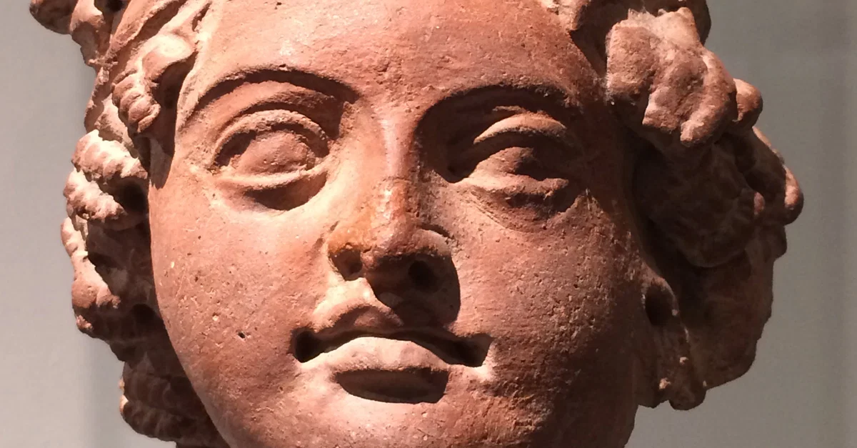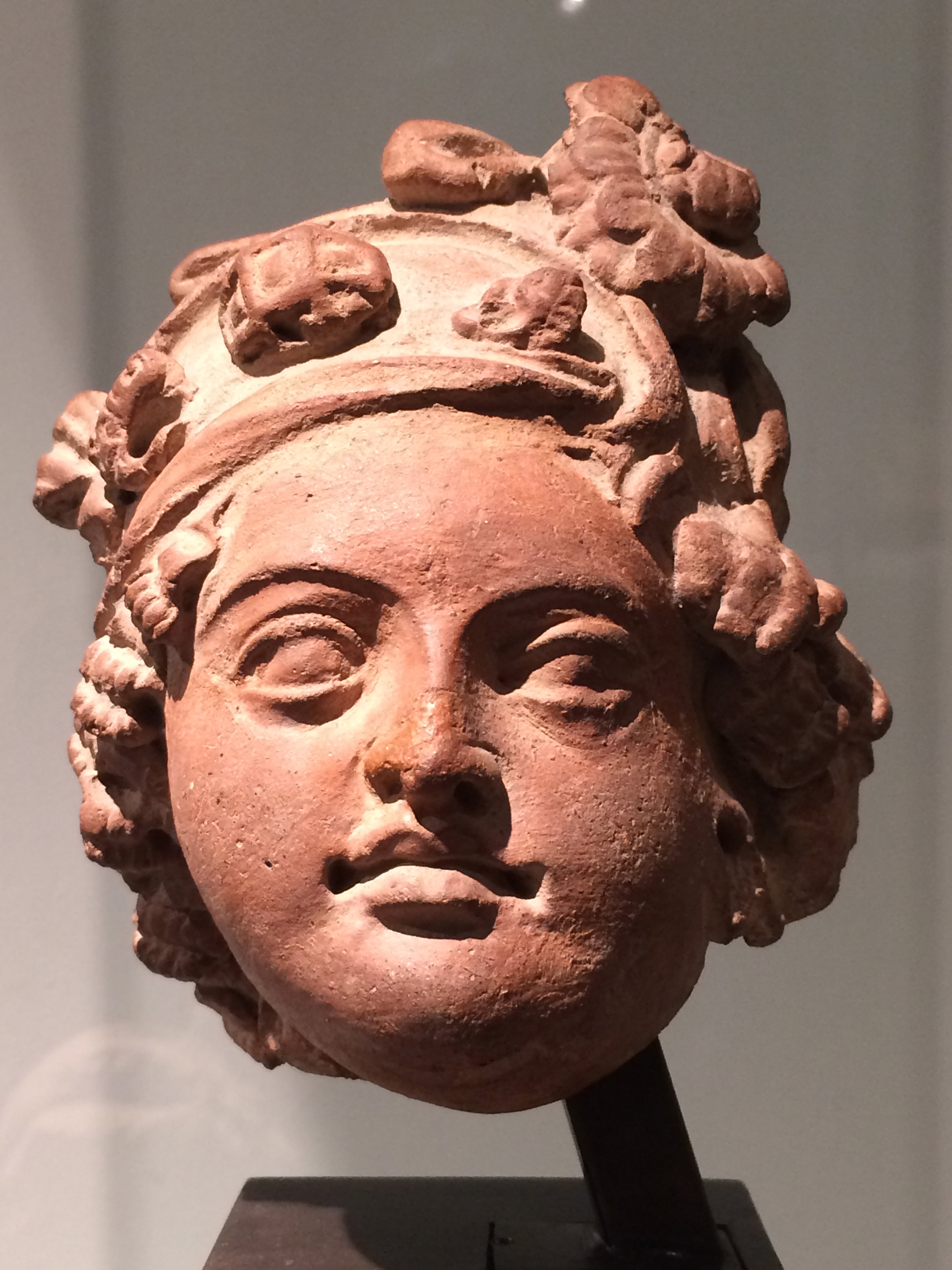 A red terracotta head of a turbaned woman, Kashmir, Akhnur. 6th century CE. (Musée Guimet, Paris)