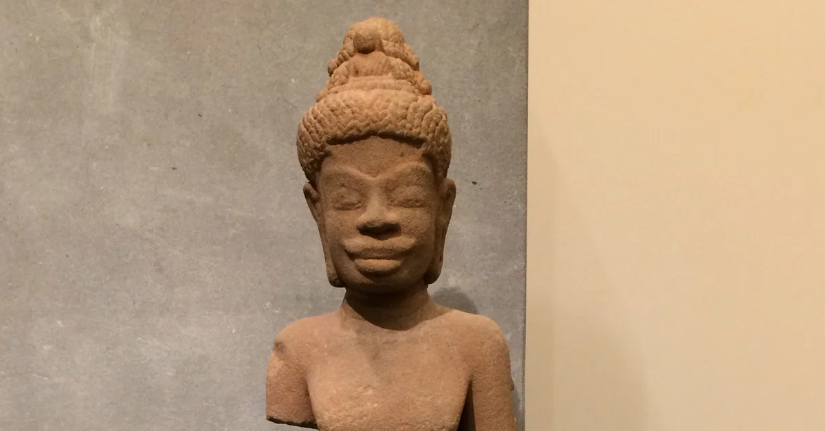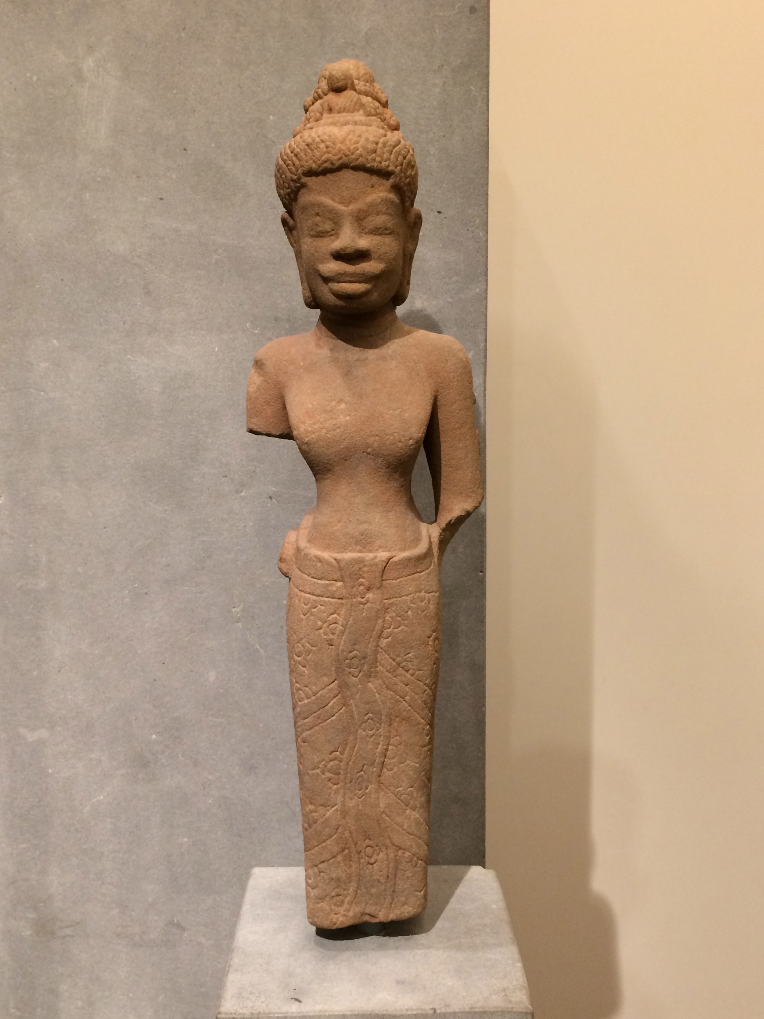 A limestone statue of a bodhisattva. My Duc, Quang Binh province, Vietnam. 9th-10th century CE. (Musée Guimet, Paris)