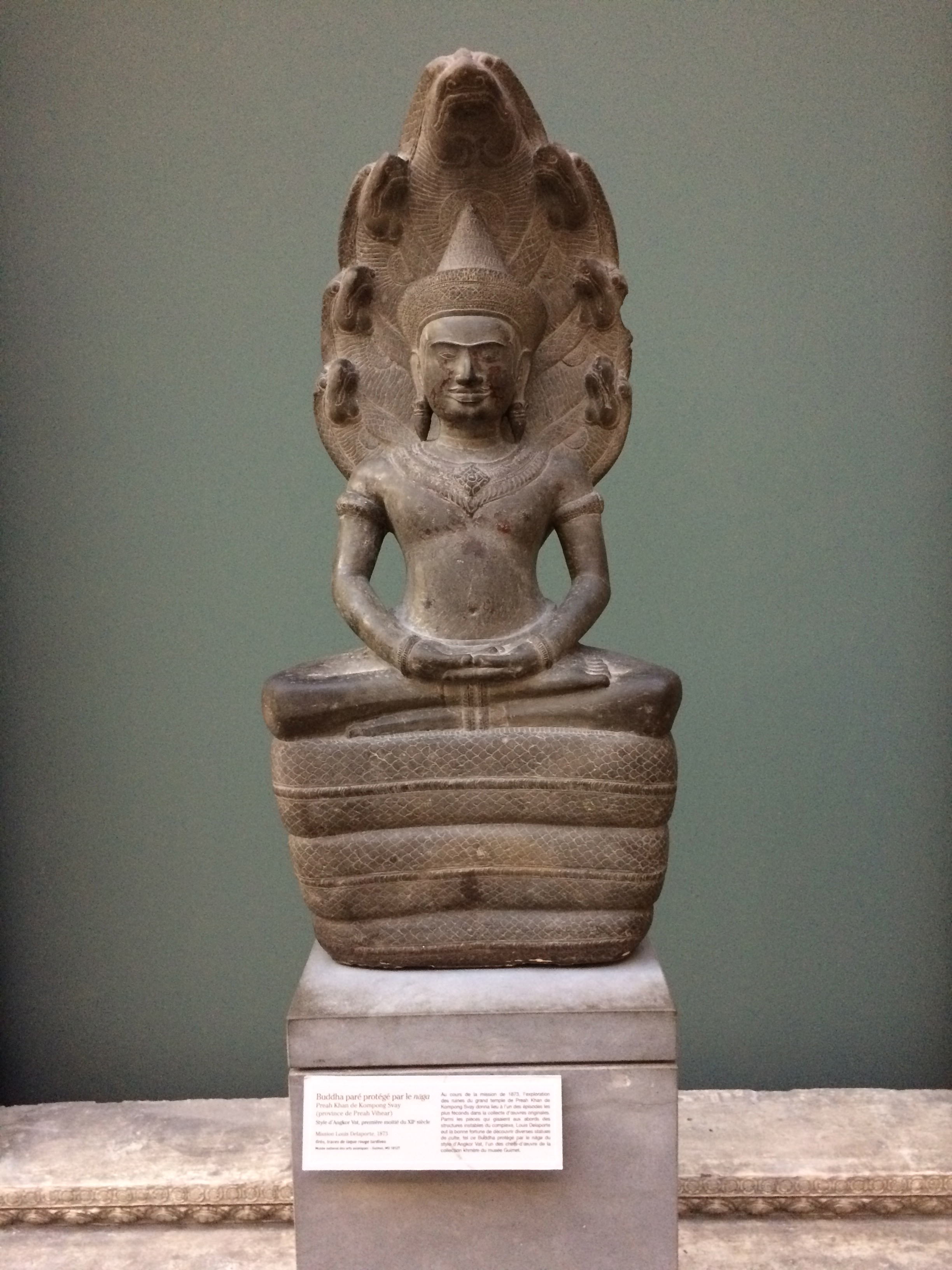 A limestone figure of a seated Buddha protected by Naga. Preah Khan Kompong Svay, Cambodia. 12th century CE. (Musée Guimet, Paris)