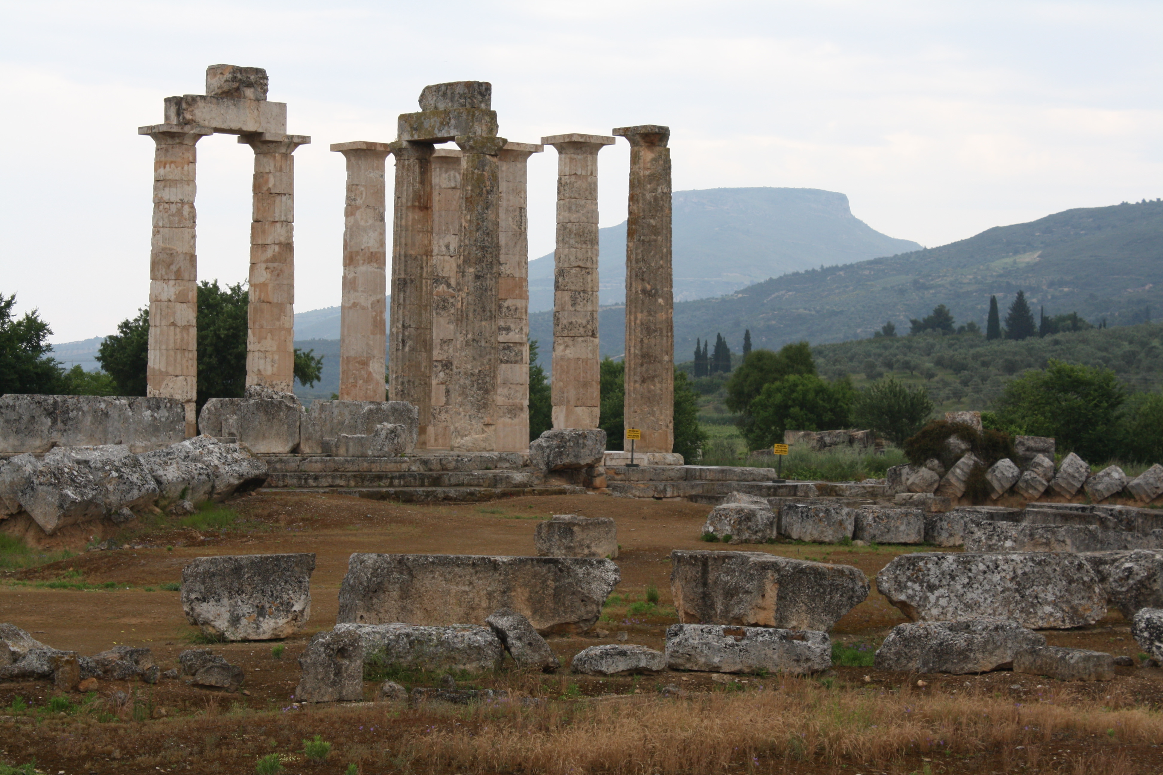 The temple of Zeus at Nemea was constructed in c. 330 BCE and replaced an earlier temple which had stood from the 6th to 5th century BCE. Inside was a cult statue of the god. The temple was composed of an exterior Doric peristyle (6x12 unusually tall and slim columns) with an interior Corinthian colonade, topped by a second story of the Ionic order. There were no sculpted decorations on the exterior. It is regarded as the last of the great Doric temples of the Classical tradition. The temple measures a little over 20x42m, the material used is locally quaried limestone. Three of the now standing columns have stood since original construction (slighty darker colour), the others have been repositioned in the early 2000's CE using the orginal, fallen drums.