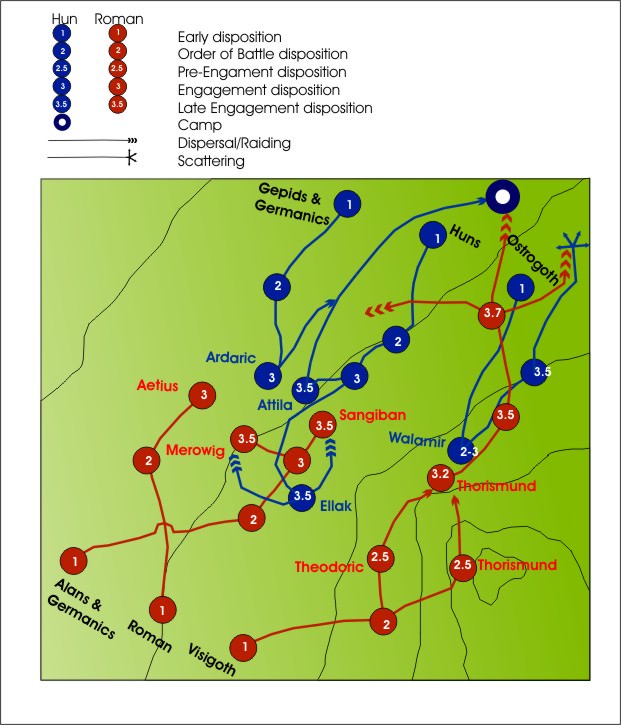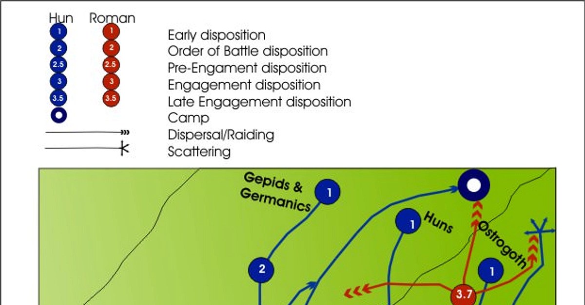A map illustrating the disposition of troops and their deployment in the Battle of Catalaunian Fields (aka Chalons) between the armies of Rome and the Huns led by Atilla, 451 CE.