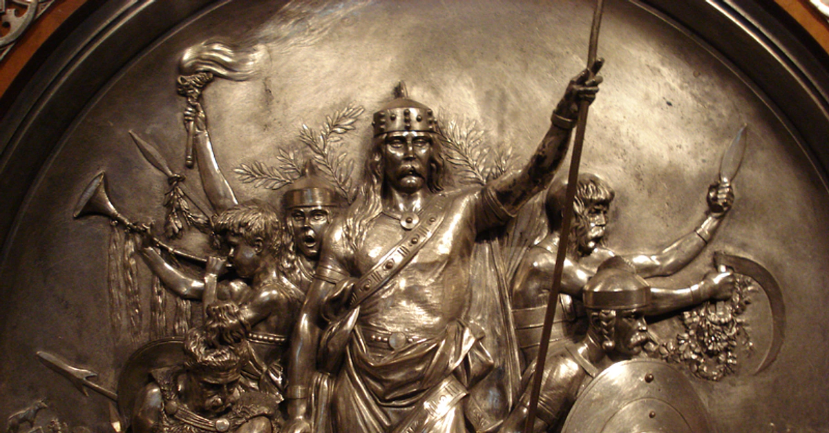 A silvered bronze mount of an armoire depicting the victory of Merovingian King Merovech over the armies of Attila the Hun in 451 CE at the Battle of Catalaunian Fields. By Emmanuel Fremiet, 1867 CE (Metropolitan Museum of Art, New York)