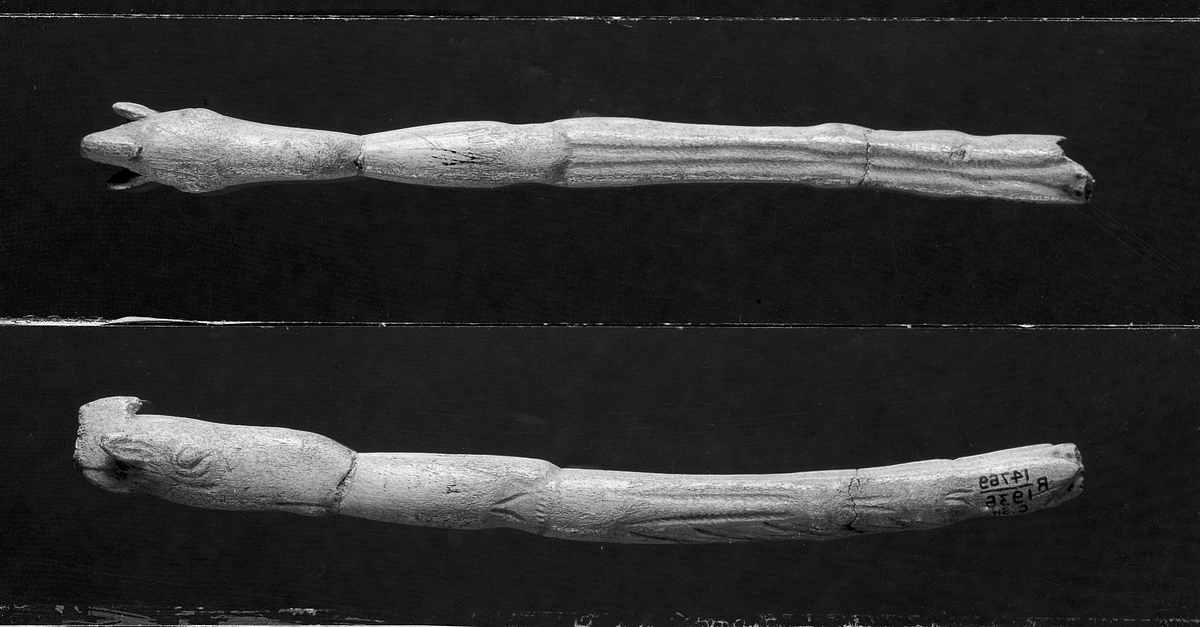 Spear thrower made out of bone and decorated with a carving of a horse's head. It belongs to the western European Magdalenian culture (c. 17,000 - c. 10,000 years ago) of the Late- or Upper Palaeolithic industry (c. 50,000/40,000 c. 10,000 years ago). The hook that the arrow would have been fitted on is clearly visible.