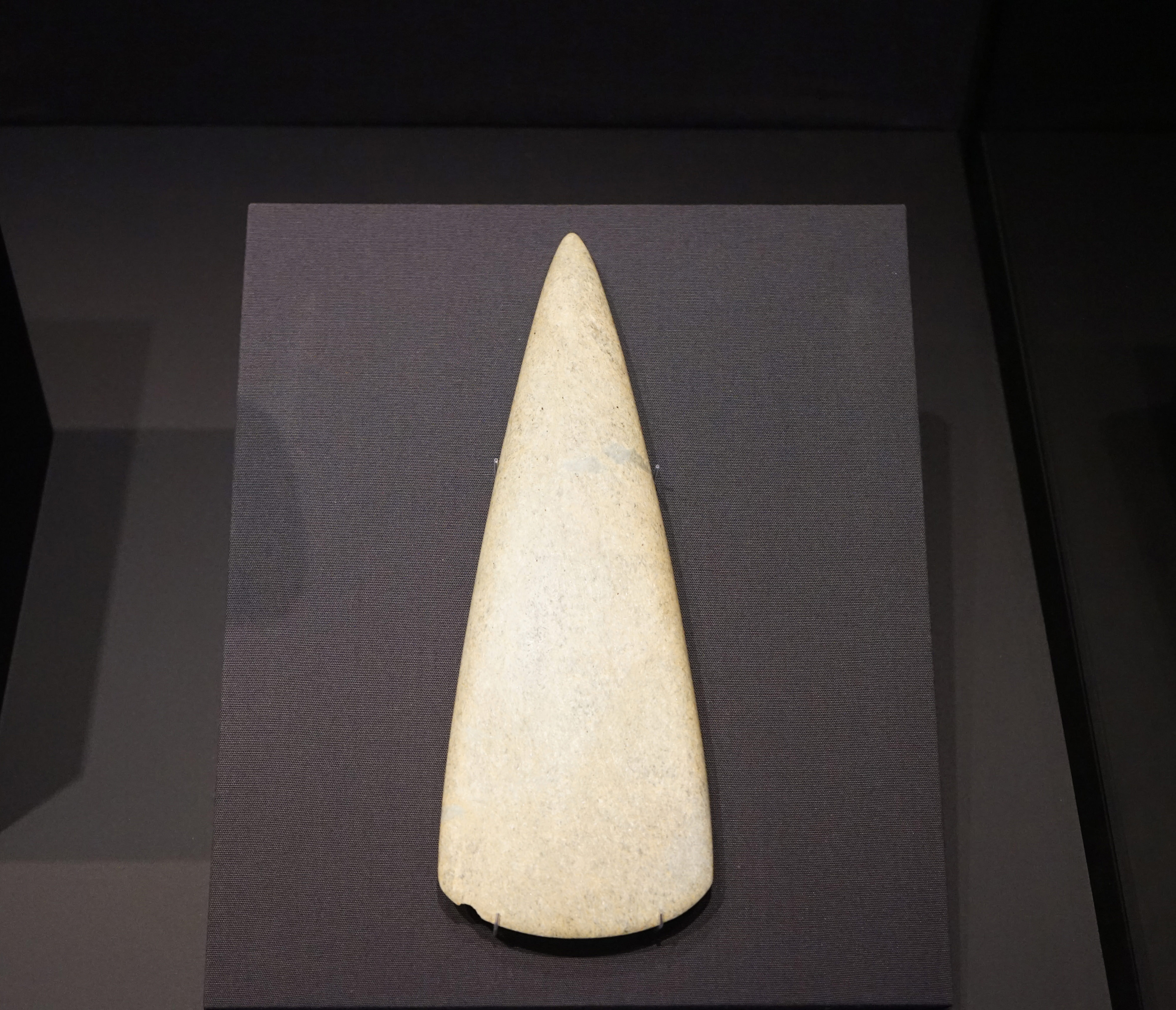 Jade, 5000-3600 BCE. Biebrich, Germany. This axe is made of European jade mined in prehistoric quarries in the Italian Alps. It appears to be an object of beauty rather than function. It would have taken several days to polish this jade object by grinding it against stone, polishing with fine sand or silt and rubbing by hand with grass or leaves. This image was taken at the National Museum of Australia in the British Museum travelling exhibition A History of the World in 100 (and 1) Objects.