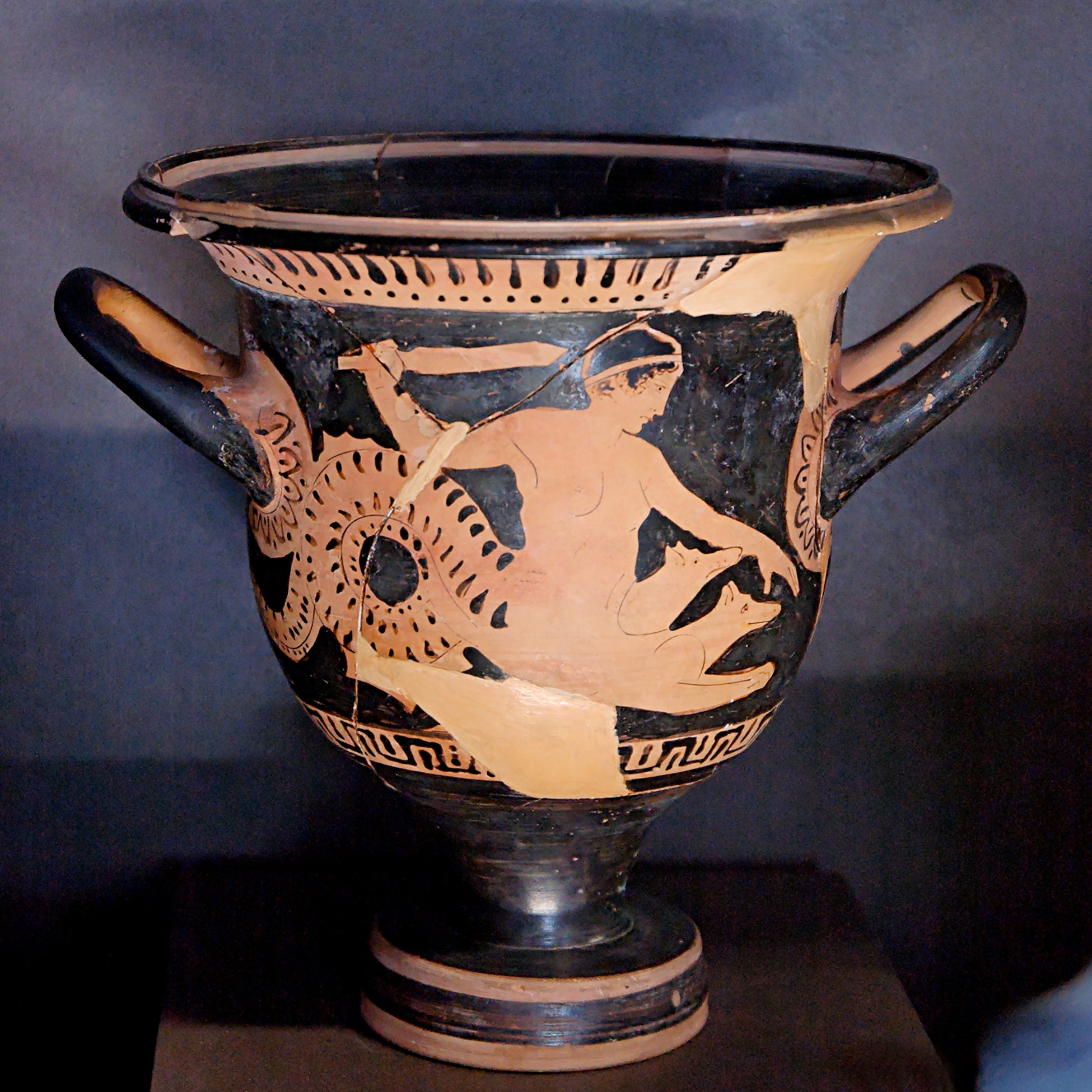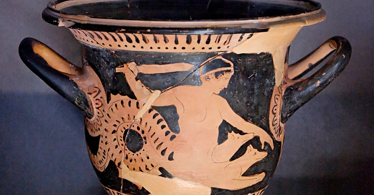 A red-figure vase depicting Scylla, the monster who preyed on victims going through the Straits of Messina. Boeotian, 450-425 BCE.