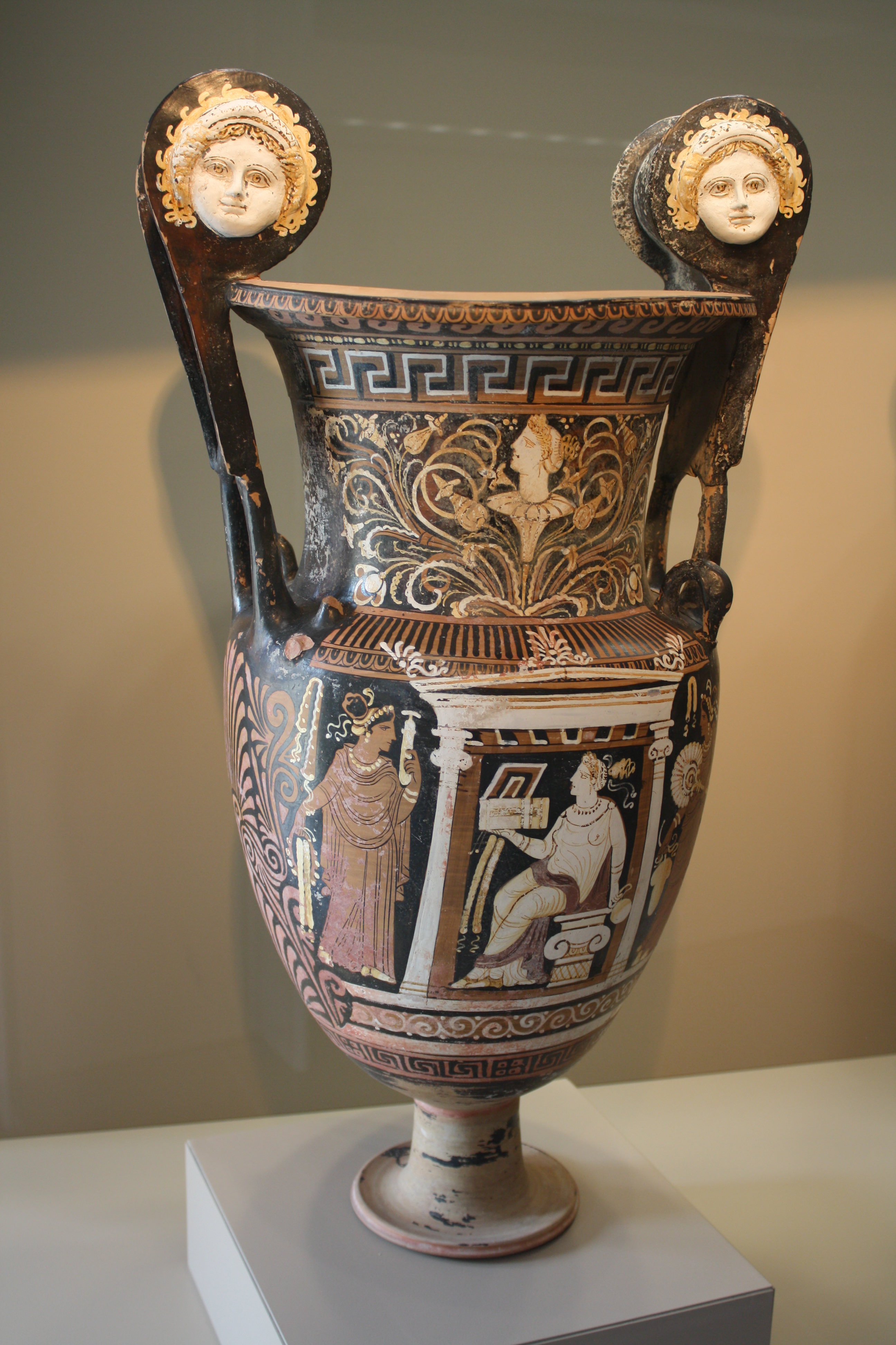 This vessel was used to mix wine and water and dates from the second half of the fourth century BCE. Provenance: Apula. Depicted are two female figures with gifts approaching a deceased person seated on a funeral monument. (Archaeological Museum, Milan)