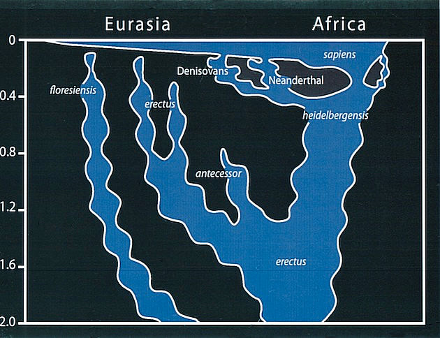 Chris Stringer's hypothesis, depicted in a graph-model, of the evolution of several species of genus Homo over the last 2 million years (vertical axis), as published in Stringer, C. (2012). "What makes a modern human". Nature 485 (7396): 33–35.