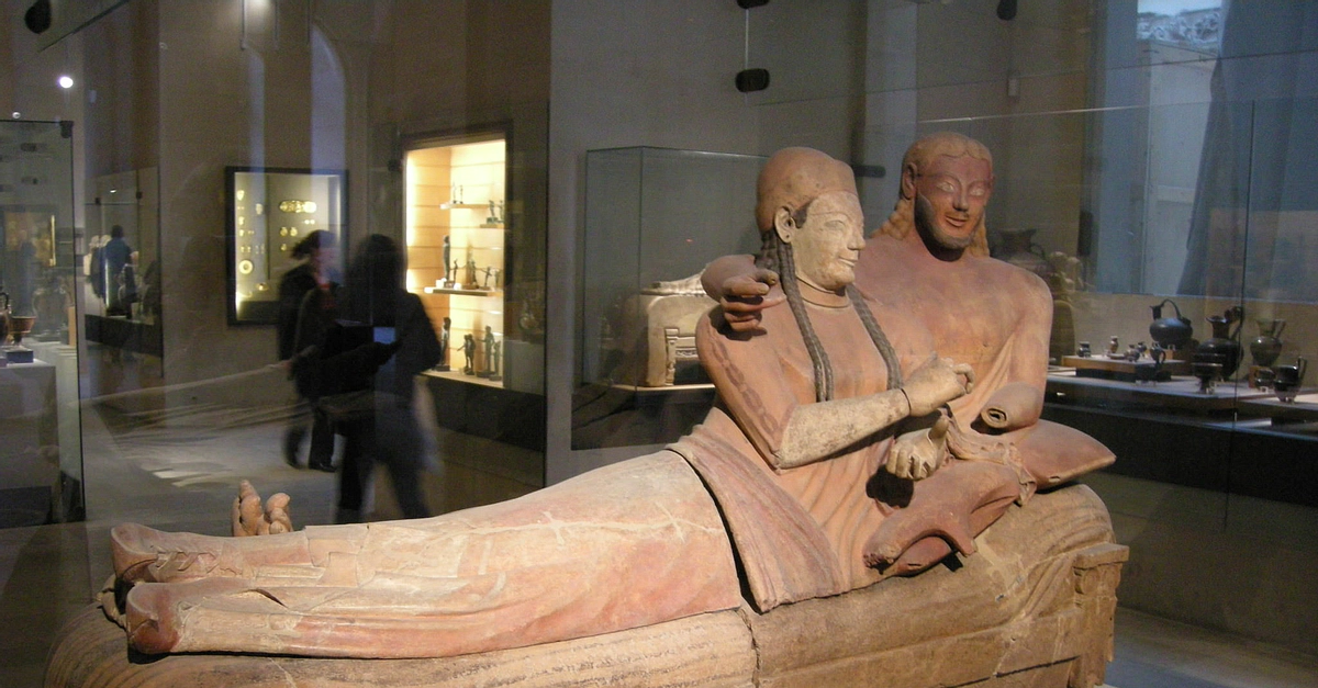 The painted terracotta Sarcophagus of the Married Couple from the Etruscan site of Cerveteri. c. 530-520 BCE. Length: 1,9 m. (Louvre Museum, Paris)