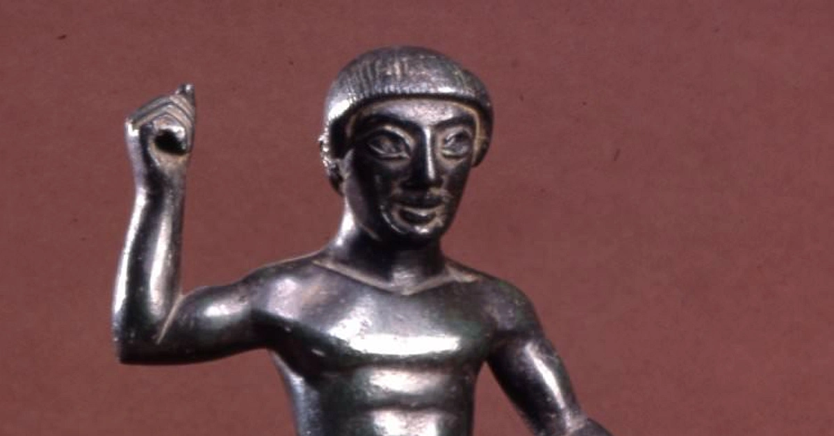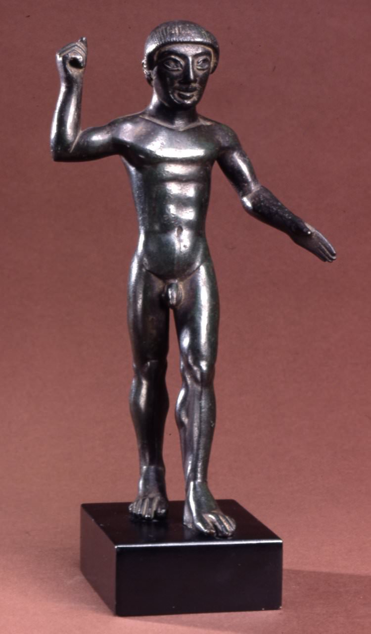 A bronze votive statuette of a youth. Etruscan, Chiusi, 530-480 BCE. Height: 27.4 cms. (British Museum, London)