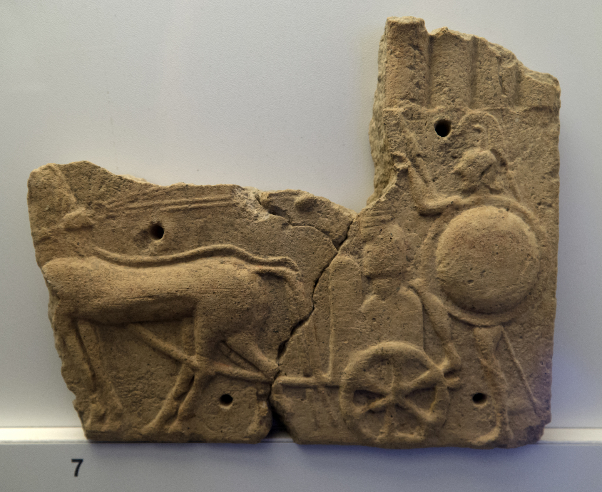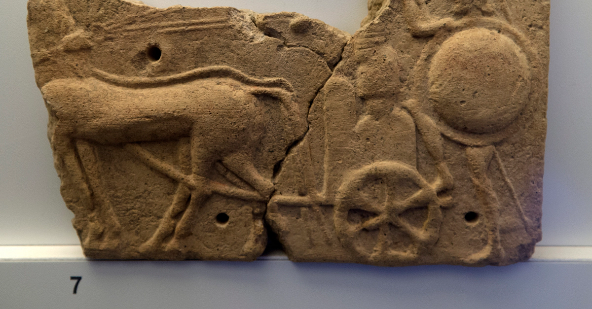 A terracotta revetment plaque showing a charioteer. From the Etruscan site of Acquarossa, central Italy. 570-560 BCE. (National Etruscan Museum of Viterbo, Italy)