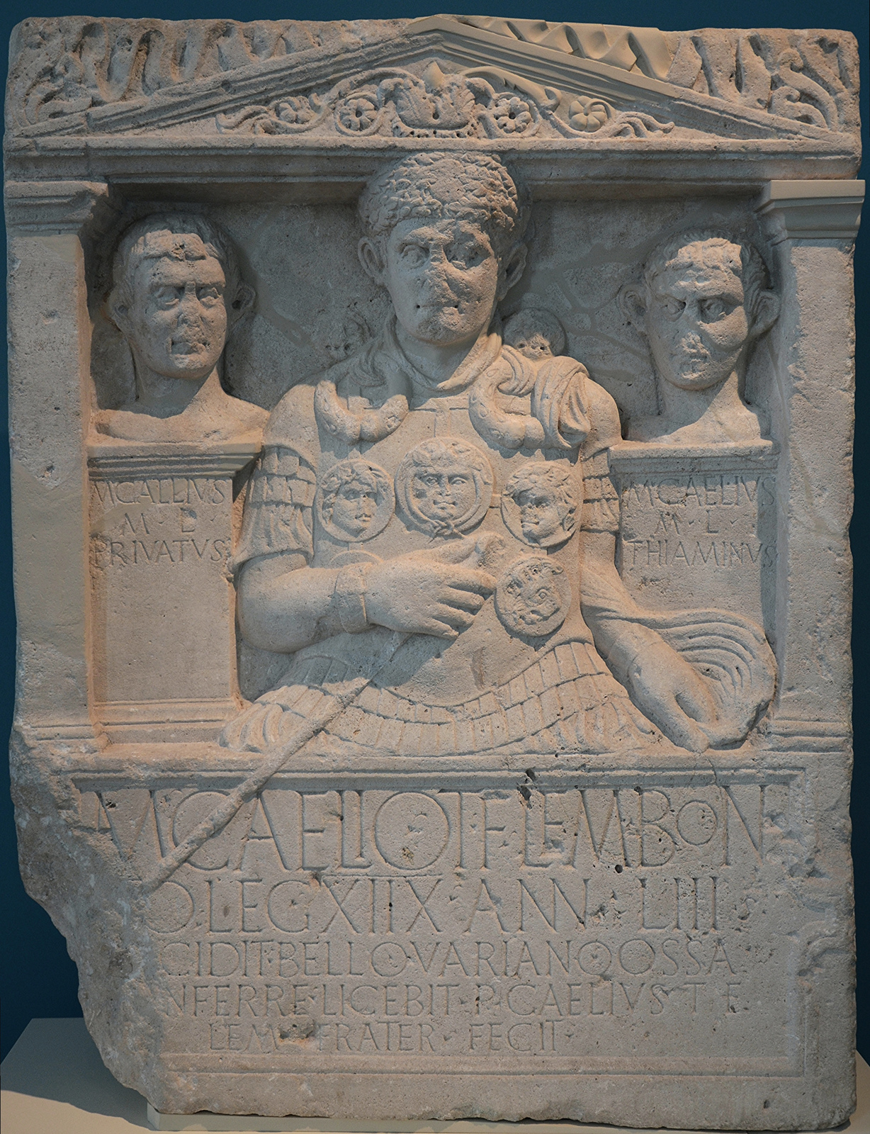 Cenotaph of Marcus Caelius, 1st centurion of Legio XVIII who fell in the war of Varus, the Battle in the Teutoburg Forest in 9 CE. (LVR-LandesMuseum Bonn) Inscription: "To Marcus Caelius, son of Titus, of the Lemonian district, from Bologna, first centurion of the eighteenth legion. 53½ years old. He fell in the Varian War. His bones may be interred here. Publius Caelius, son of Titus, of the Lemonian district, his brother, erected (this monument).