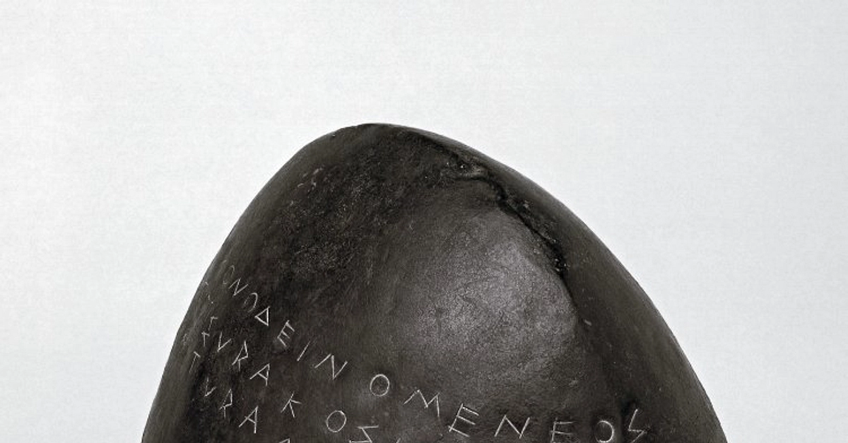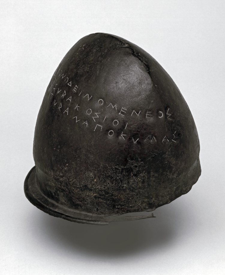 An Etruscan bronze helmet, 5th century BCE. Discovered at Olympia, it was dedicated there and carries an inscription: 'Hieron, son of Deinomenes, and the Syracusans, [dedicated] to Zeus Etruscan [spoils] from Cumae'. Height: 20 cm. (British Museum, London)