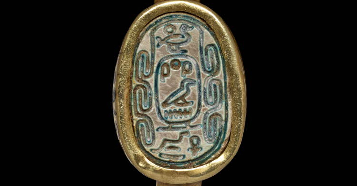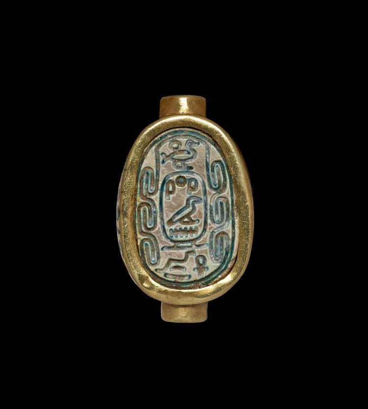 Finger-ring comprising a green-blue glazed steatite scarab (clypeus marked, humeral callosities present, feathered legs, pierced longitudinally, base inscribed with a cartouche of Khyan with epithets enclosed within a continuous spiral border, pierced longitudinally) in a gold mount. (British Museum, London)