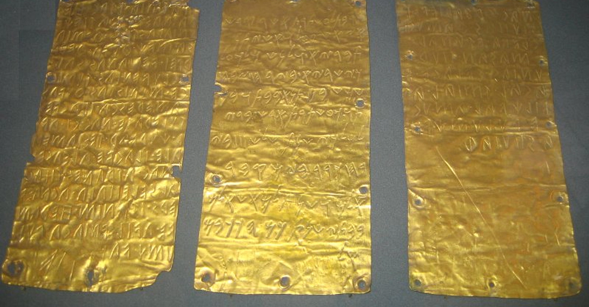 Gold sheet plaques from Pygri, the port of Etruscan Cerveteri. In both the Etruscan and Phoenician alphabet they describe the separation of a space dedicated in the temple there for Astarte. c. 500 BCE (Museo di Villa Giulia, Rome)