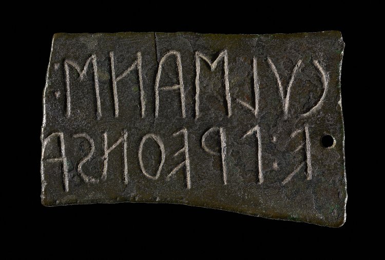 A copper alloy plaque with an inscription in the Etruscan alphabet. The inscription reads from right to left and the top line is the name of the god Culsans, the second line is as yet undeciphered. 3rd - 2nd century BCE. (British Museum, London)