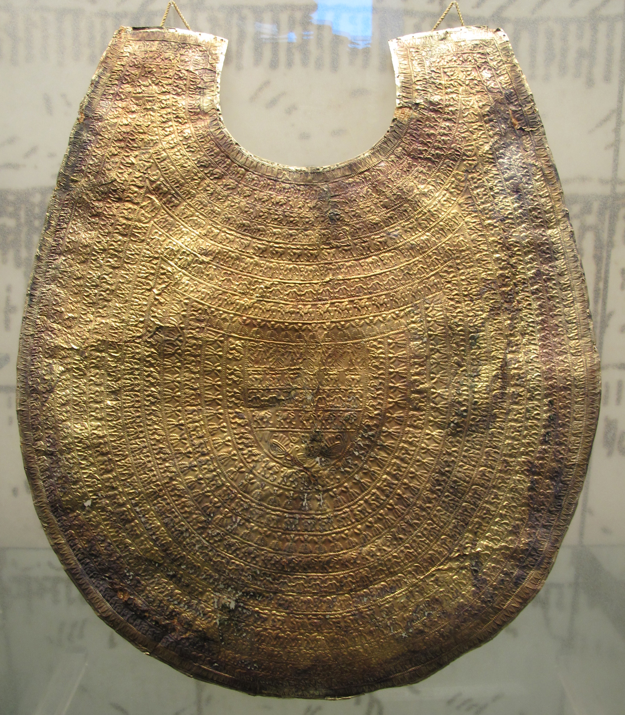 A gold sheet pectoral from the Etruscan Regolini-Galassi Tomb at Cerveteri, Italy. 7th century BCE. Height: 42 cm. (Vatican Museums, Rome)