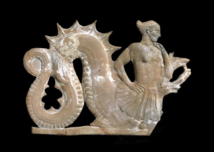 A terracotta plaque depicting Scylla the sea monster from Greek mythology thought to inhabit the straits between Sicily and the Italian mainland, from the Cyclades, 450 BCE. Height: 12.5 cm.