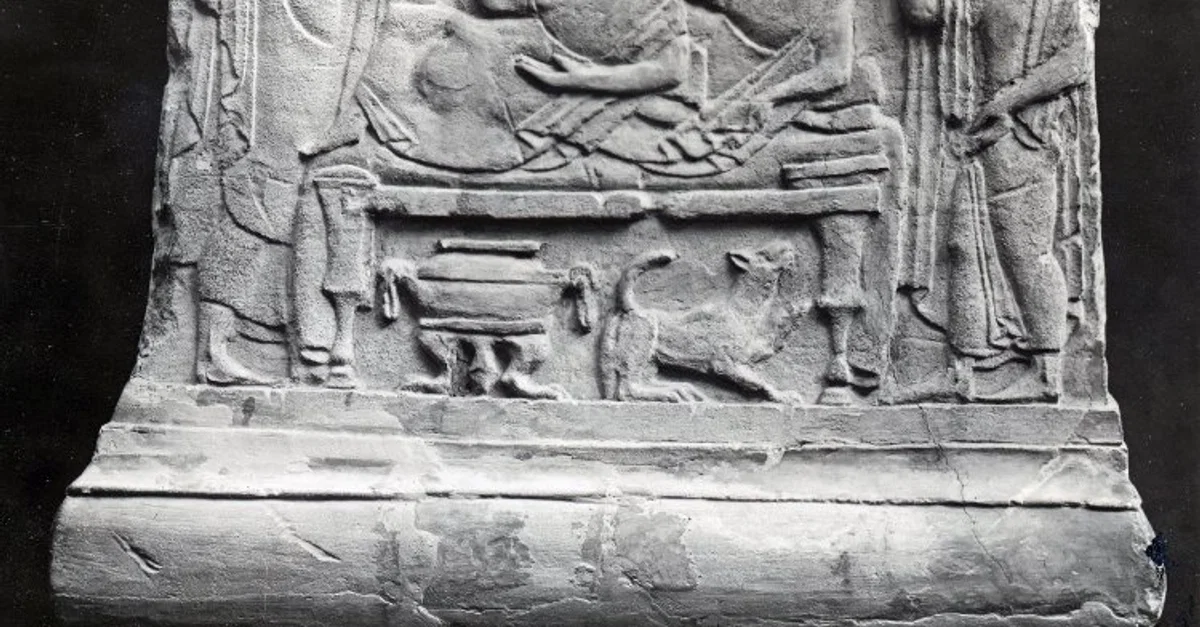 A scene from a stone Etruscan funerary urn depicting a banquet scene. Chiusi, 5th century BCE. (British Museum, London)