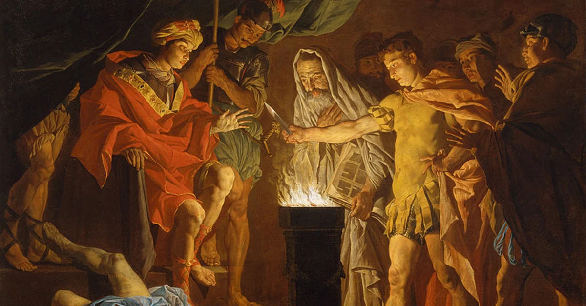 A 17th century CE oil painting by Matthias Stomer depicting the legendary Etruscan king of Chiusi Lars Porsenna and the Roman hero Mucius Scaevola. Porsenna attacked Rome c. 508 BCE and the captured Mucius put his hand in a fire to prove he would not succumb to torture. (Art Gallery of New South Wales, Sydney)