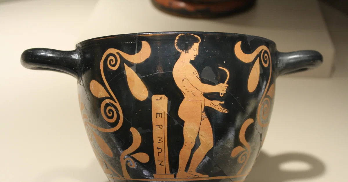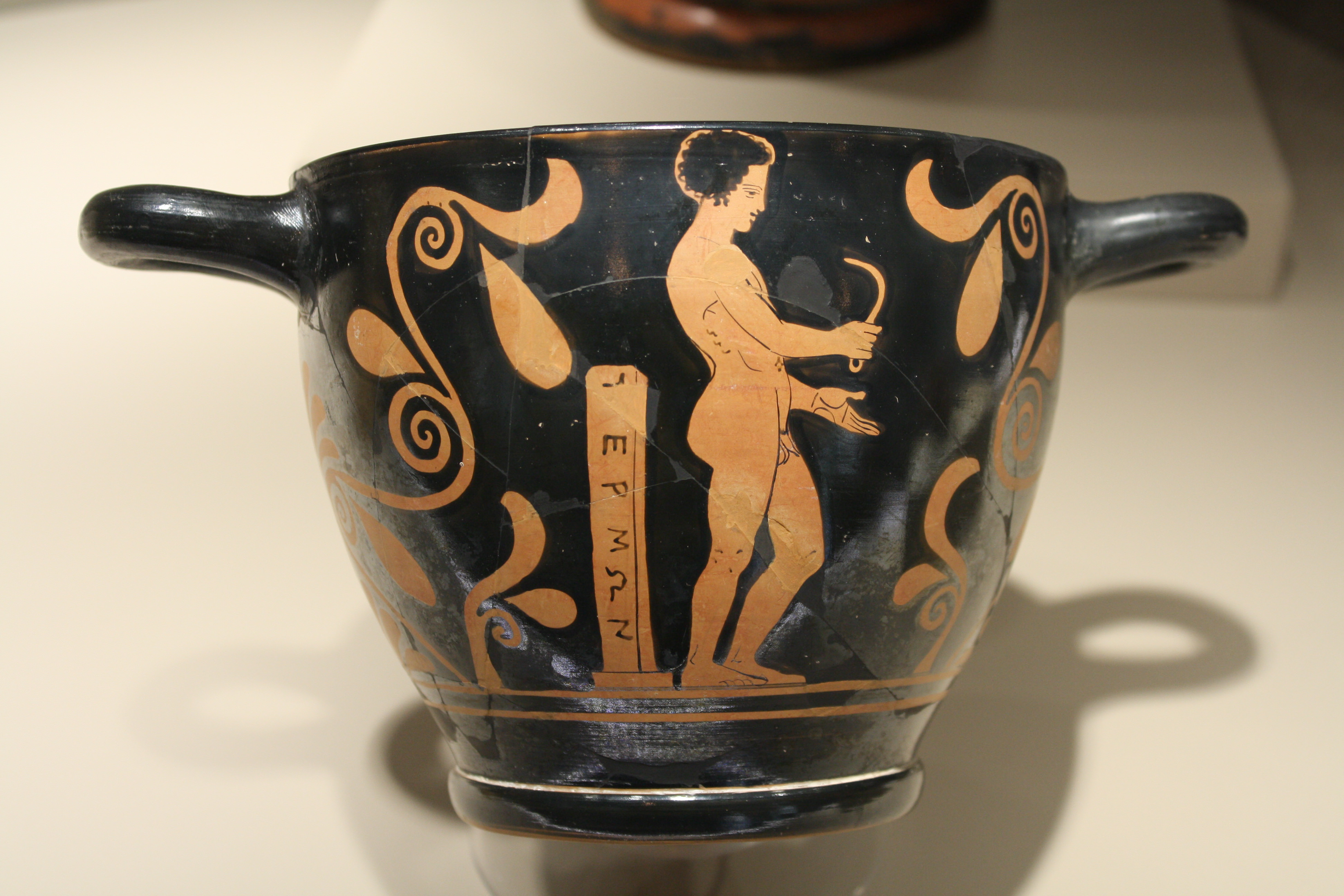 Red figure skyphos or cup (410 BCE) depicting a nude athlete holding a strigil - used to clean the body of oil, dust and sweat after exercise. To the left is possibly a mid-race marker post. Attributed to the Amykos painter, Lucana (Southern Italy). (Archaeological Museum, Milan)