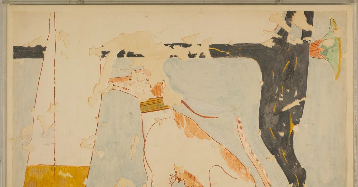 Facsimile of a detail from a wall painting in the Tomb of Nebamun showing a dog seated beneath its master's chair. From Thebes, Egypt, 18th Dynasty, 1479-1458 BCE.