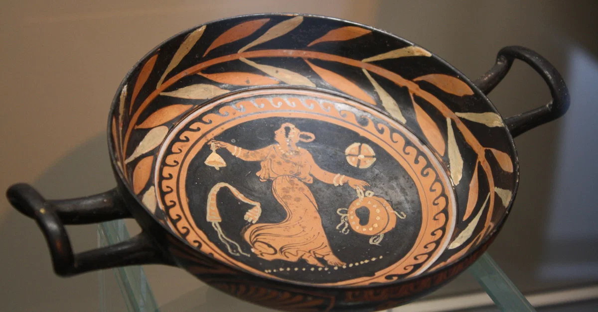 Greek red figure stemless cup from Apula, 330-320 BCE, depicting a dancing maenad - female follower of Dionysus - holding a bell and tambourine. (Archaeological Museum, Milan)