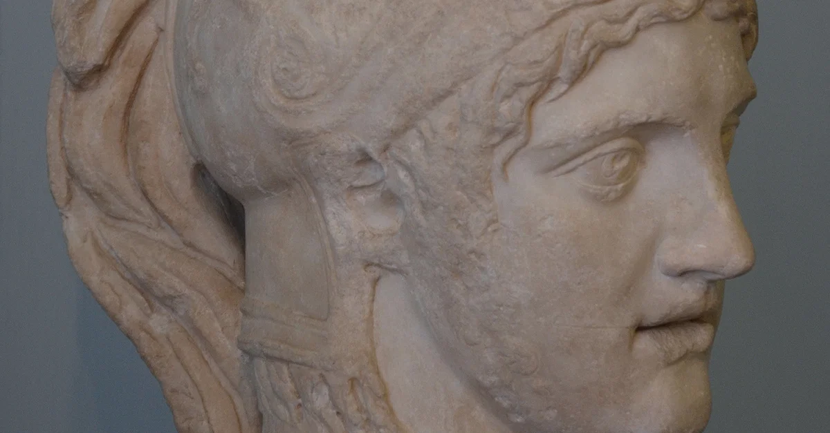 A Roman marble head of Ares, god of war. Roman copy from a 4th century BCE Greek bronze original by Alkamenes. Centrale Montemartini, Rome.
