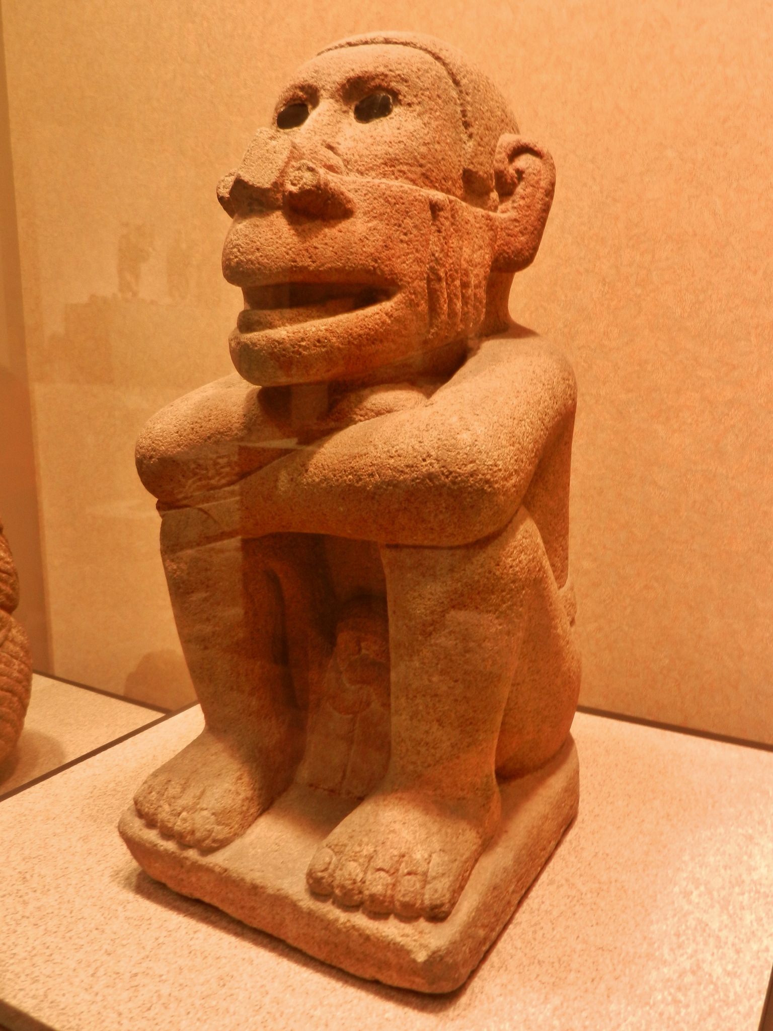 A statue of Ehecatl, the Mesoamerican god of the Winds. The eyes are of obsidian and he wears his typical beaked mask. Aztec, Late Postclassic period. (National Museum of Anthropology, Mexico City)