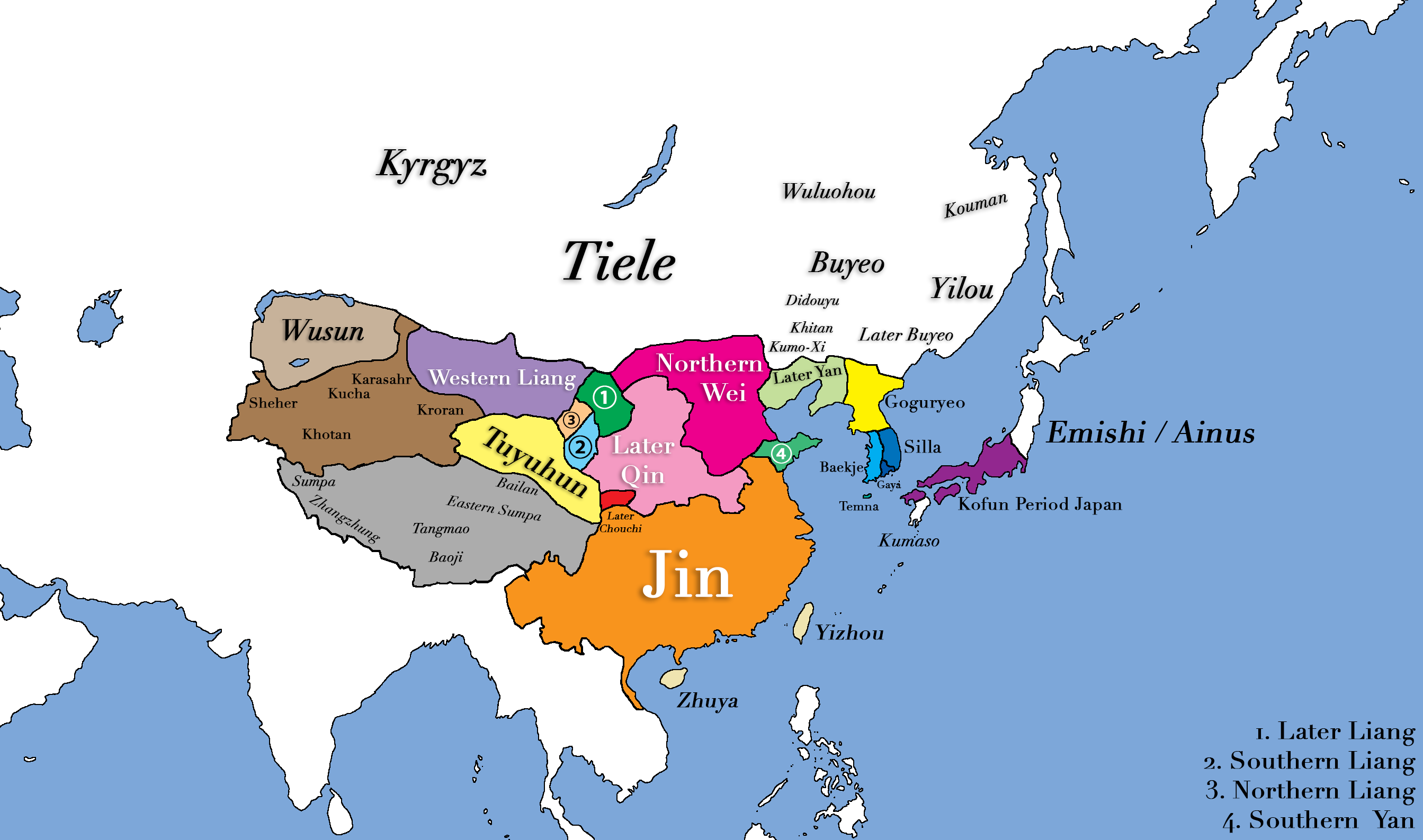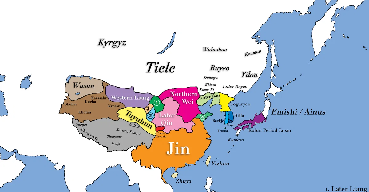 This map shows all major civilizations of East Asia at the beginning of 4th century CE. Italicized texts indicate nomadic bands or tribal societies.
