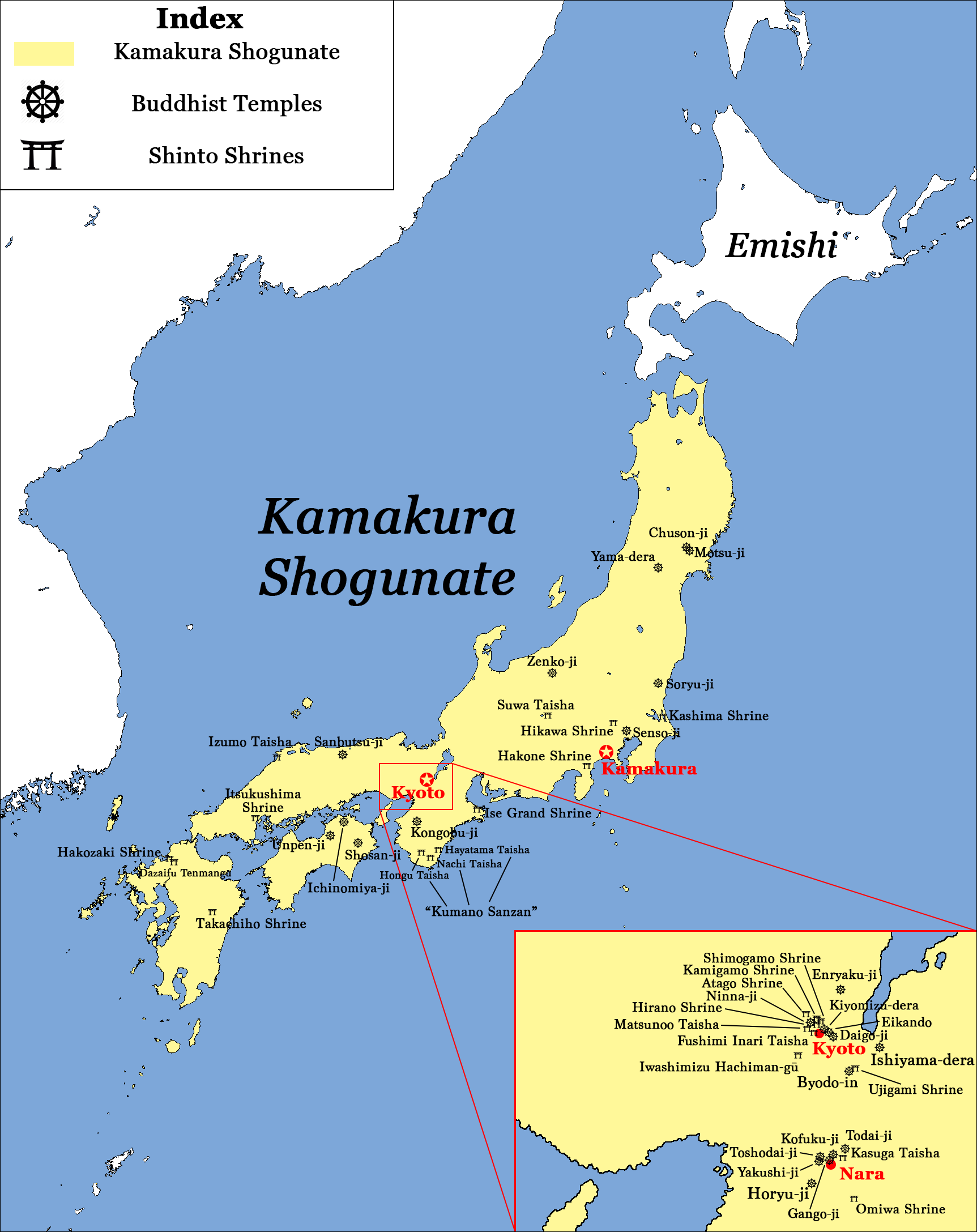 Chen, S. (2017, April 03). Major Temples and Shrines of Japan circa 1200 CE, Kamakura Shogunate. World History Encyclopedia. https://www.worldhistory.org/image/6470/major-temples-and-shrines-of-japan-circa-1200-ce-k/