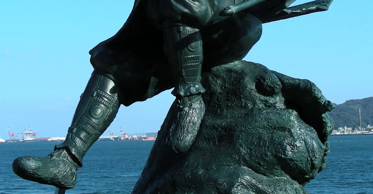 A modern statue of the legendary samurai Yoshitsune (1159-1189 CE). Mimosusogawa Park, Shimonoseki, Japan.