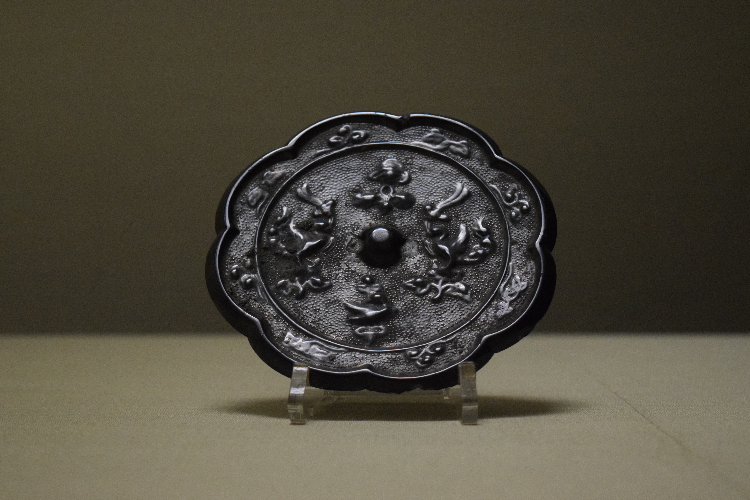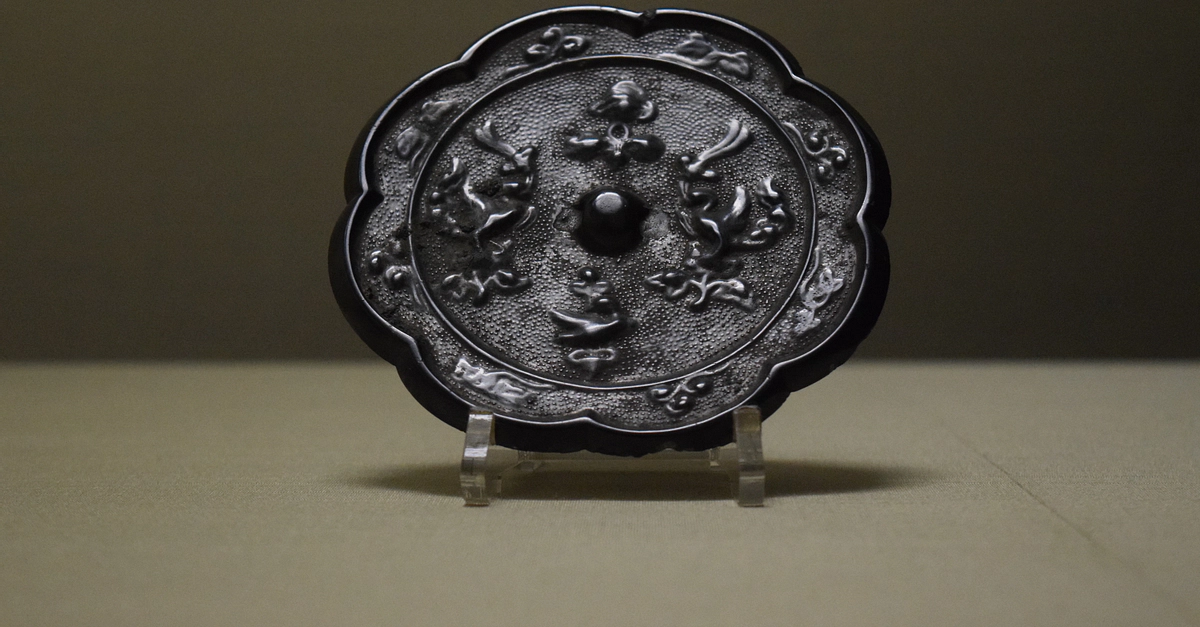 An eight-lobed cast bronze mirror with flowers and luan (a mythical bird) decoration. From Mount Tsuwado, Mukuno, Yamaga-machi, Kitsuki-shi, Oita, Japan. Nara Period, 8th century CE. Tokyo National Museum)
