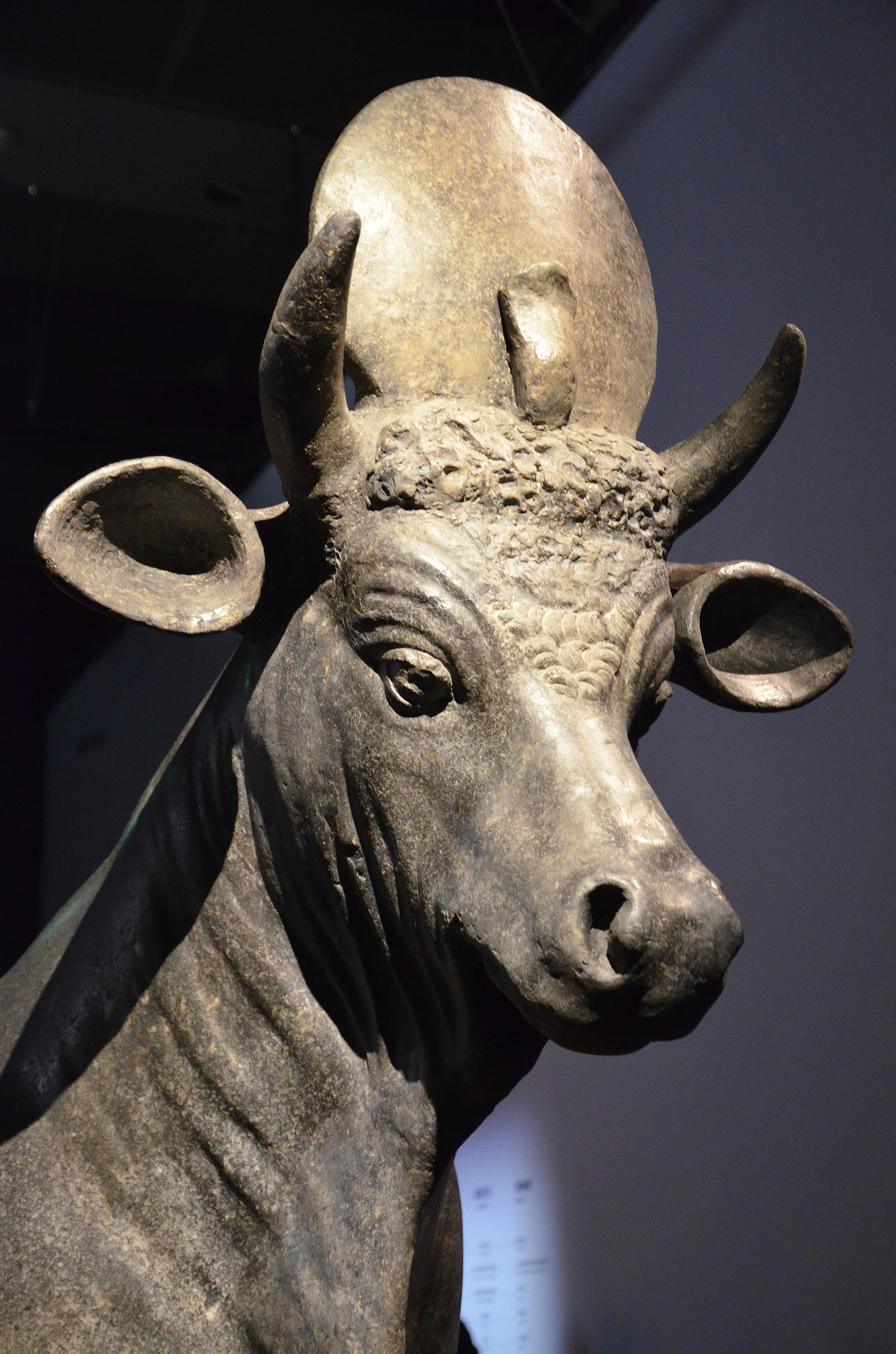 Life-size basalt statue of the Apis Bull dedicated by Hadrian to Serapis in Alexandria (Egypt), Osiris, Sunken Mysteries of Egypt exhibition, Paris (2015)