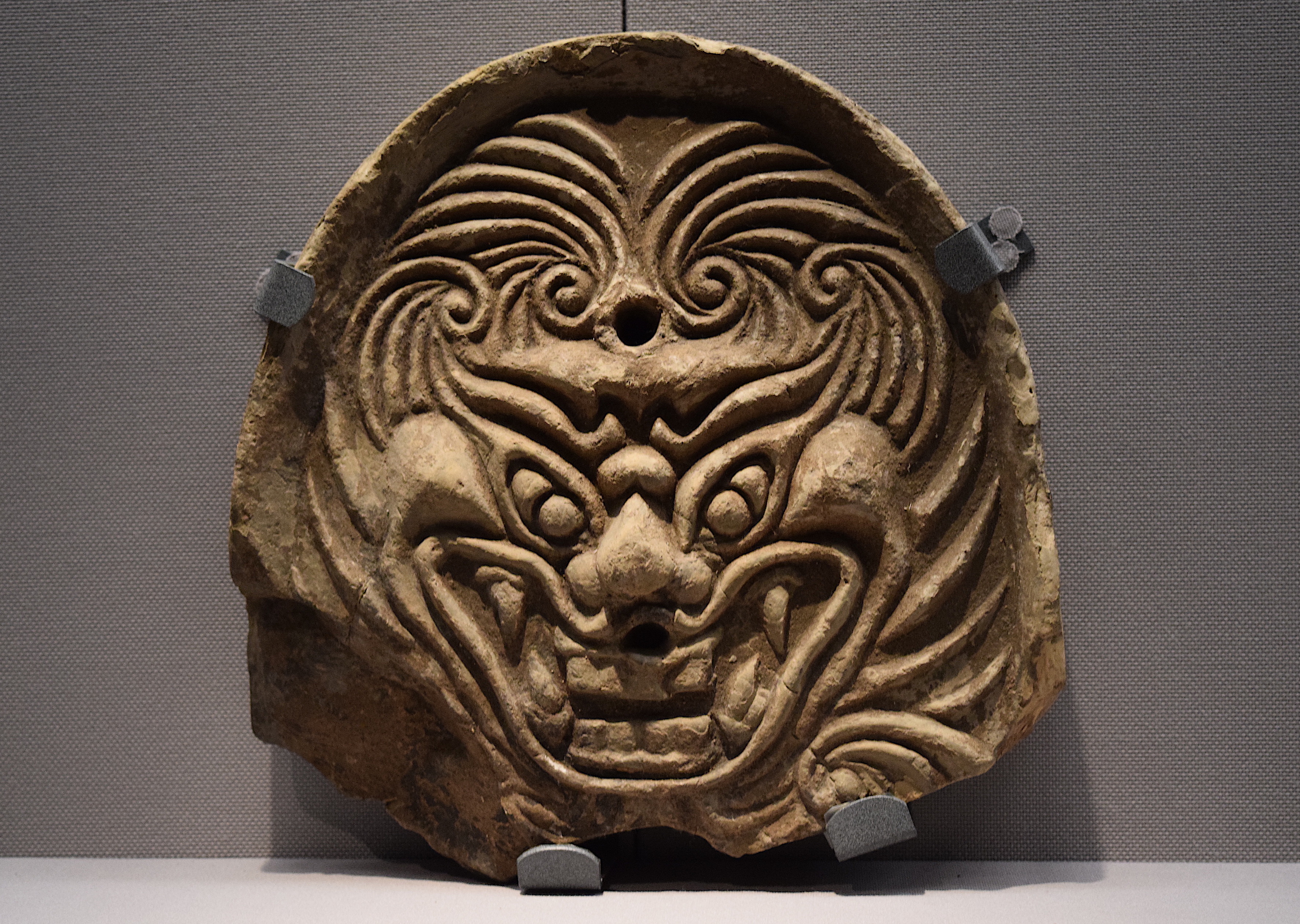 A ridge-end roof tile in the form of a demon face, Nakayama kiln, Nara, Japan. Nara Period (710-794 CE). (Tokyo National Museum)