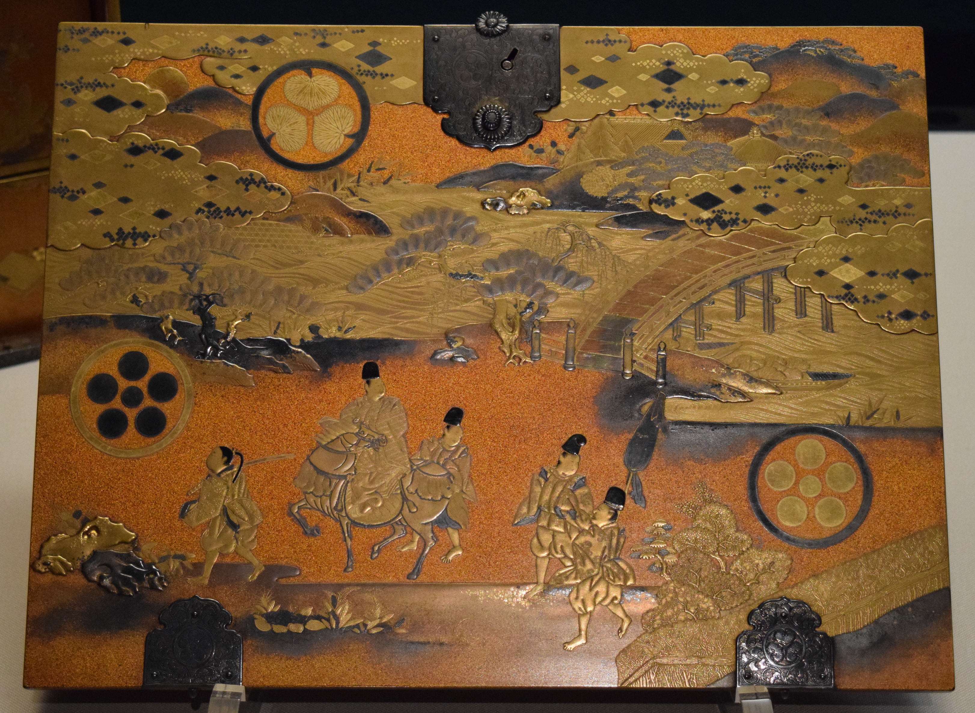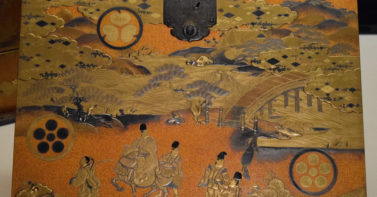 Part of a cabinet for storing volumes of the Tale of Genji, the 11th century CE classic novel by Murasaki Shikibu. The scene is from that novel. Maki-e lacquer, Edo period, 17th-18th century CE. (Tokyo National Museum)