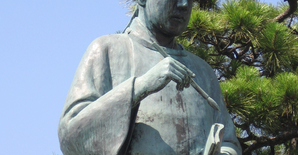 A modern statue of the Japanese poet Otomo no Yakamochi, compiler of the 8th century CE Manyoshu, an anthology of Japanese poems. Takaoka Station, Takaoka, Toyama.