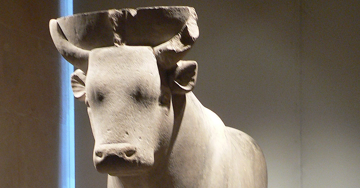 A limestone Apis bull statue from the Serapeum at Saqqara, Egypt. 30th Dynasty. Height: 1.26 m. (Louvre Museum, Paris)