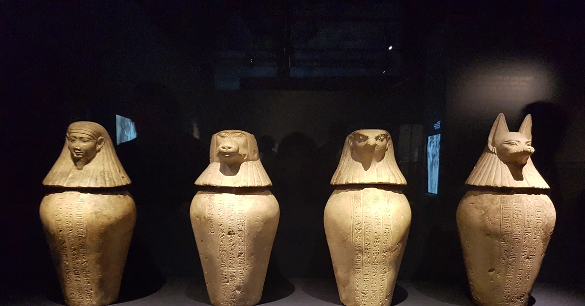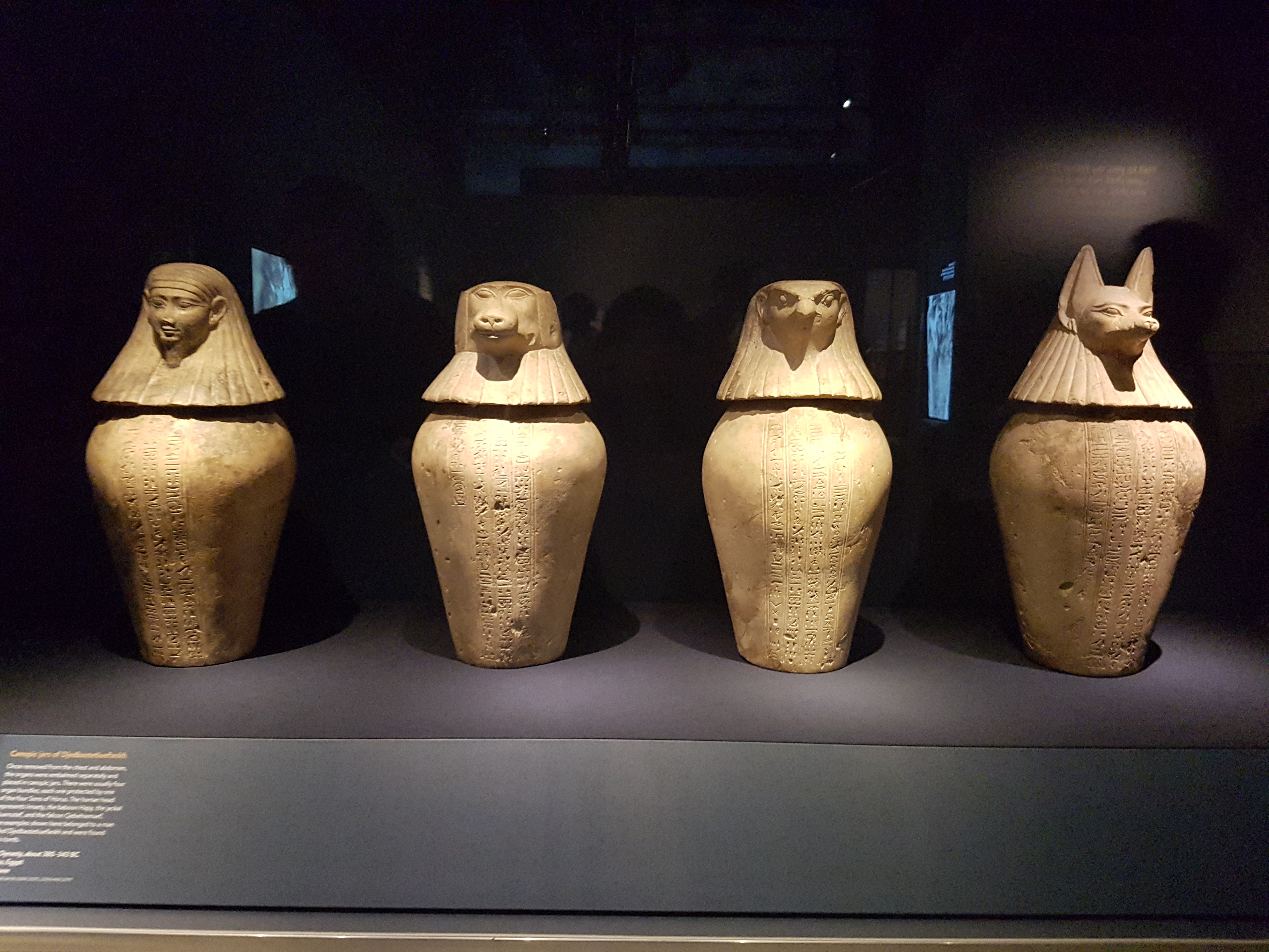 Canopic Jars Of Djedbastetiuefankh. Dynasty, about 380-343 BCE. Hawara, Egypt Limestone. Once removed from the chest and abdomen, the organs were embalmed separately and placed in canopic jars. There were usually four organ bundles, each one protected by one of the four Sons of Horus. The canopic jars shown here belong to a man called Djedbastetiuefankh and were found in his tomb. The British Museum, (photo taken at The Powerhouse Museum, Sydney Australia)