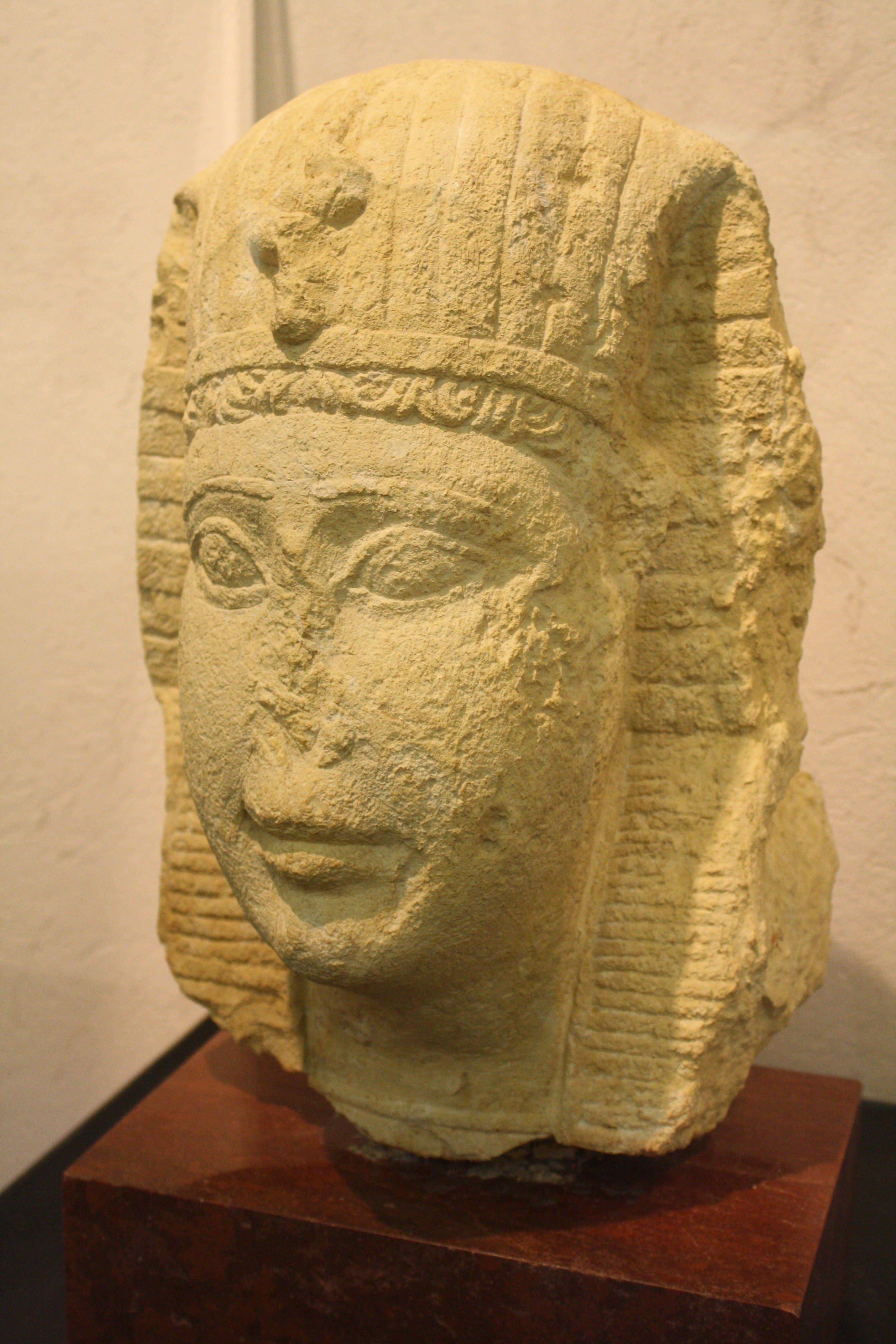 Limestone sphinx head from the Ptolemaic period, Medinet Madi, Temple of Isis-Thermutis. (Egyptian Museum, Castello Sforzesco, Milan)