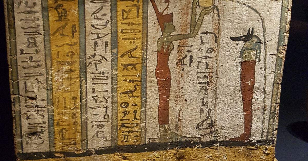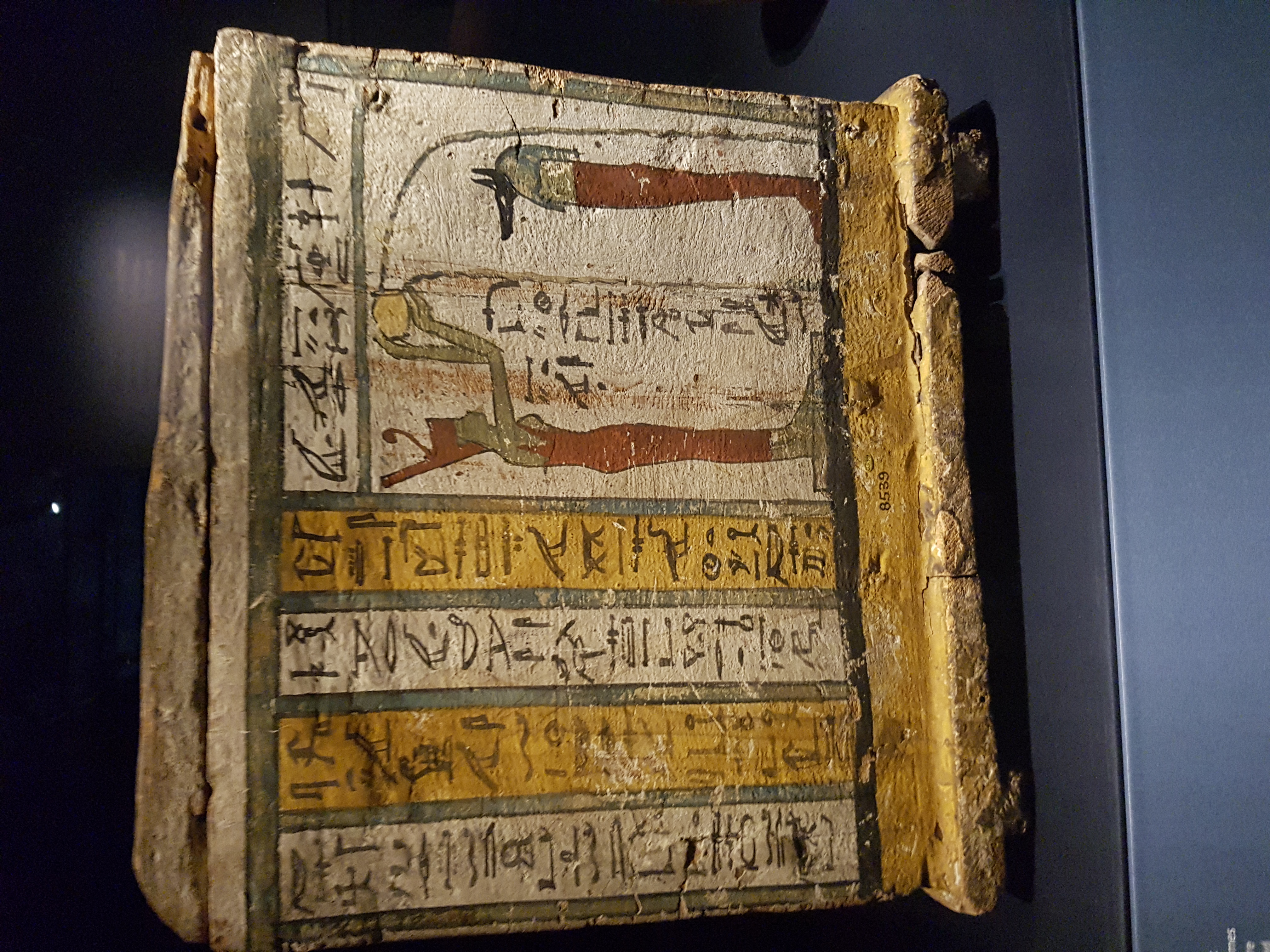 Canopic Box Of Nesaarud. 25th-early 26th Dynasties. (680-600 BCE). Probably from Thebes, Egypt. From the Middle Kingdom onwards (about 2040-1650 BCE), canopic jars were sometimes stored in boxes. Here, the Sons of Horus are depicted on each side. Each son is portrayed with a goddess who is purifying him. Neith - distinguishable in her red crown - pours water on the jackal-headed Duamutef. The British Museum (photo taken at The Powerhouse Museum, Sydney Australia)
