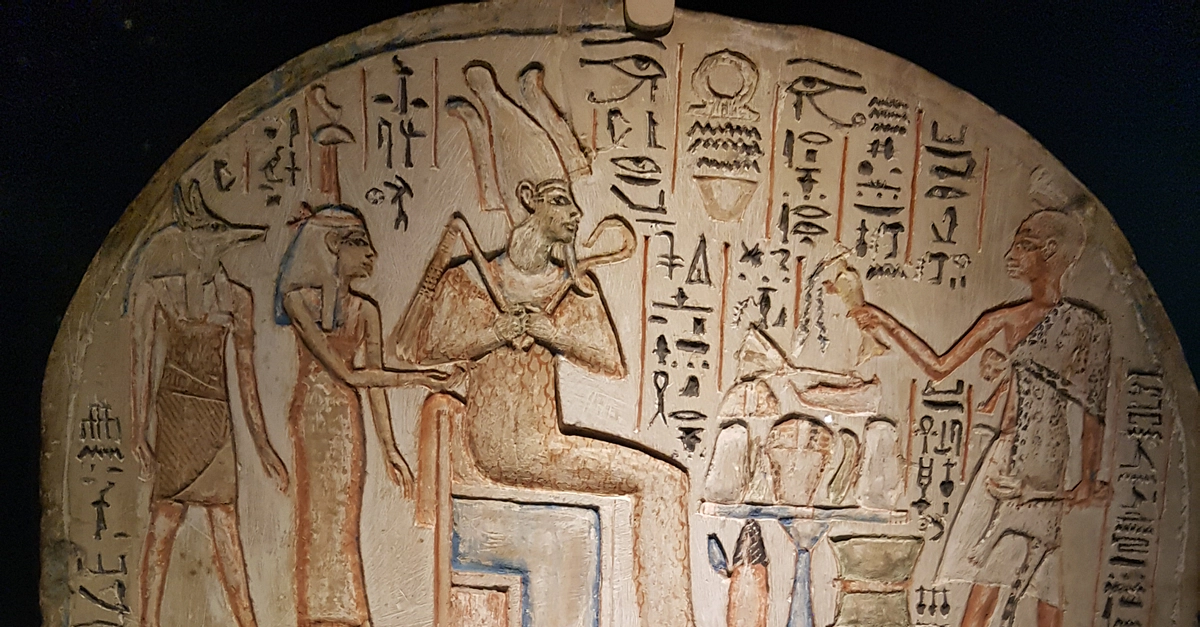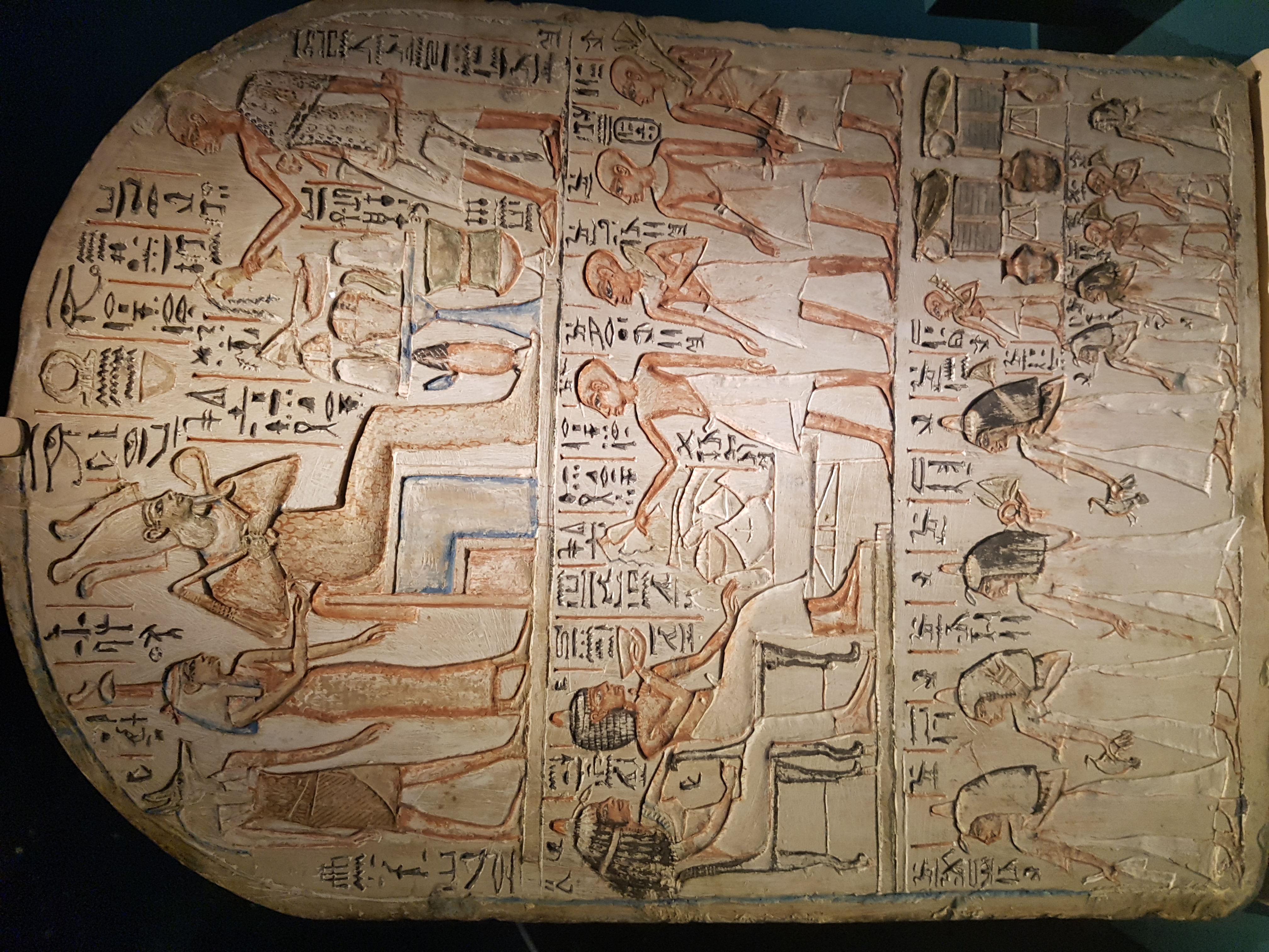 Stela of Qeh, early 19th Dynasty, about 1250 BCE. Probably from Abydos, Egypt. The British Museum, (photo taken at The Powerhouse Museum, Sydney, Australia) Priests made offerings of food and drink to both the gods and the dead. Here a funerary sem-priest, with his leopard skin, pours a libation over a sumptuous offering table intended for three gods - Osiris and Anubis. He is also burning incense. On the register below, the deceased man, Qeh, receives offerings from his son. He is shown seated with his wife Nedjempehy, drinking from a bowl.