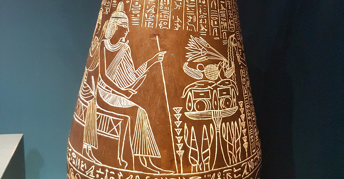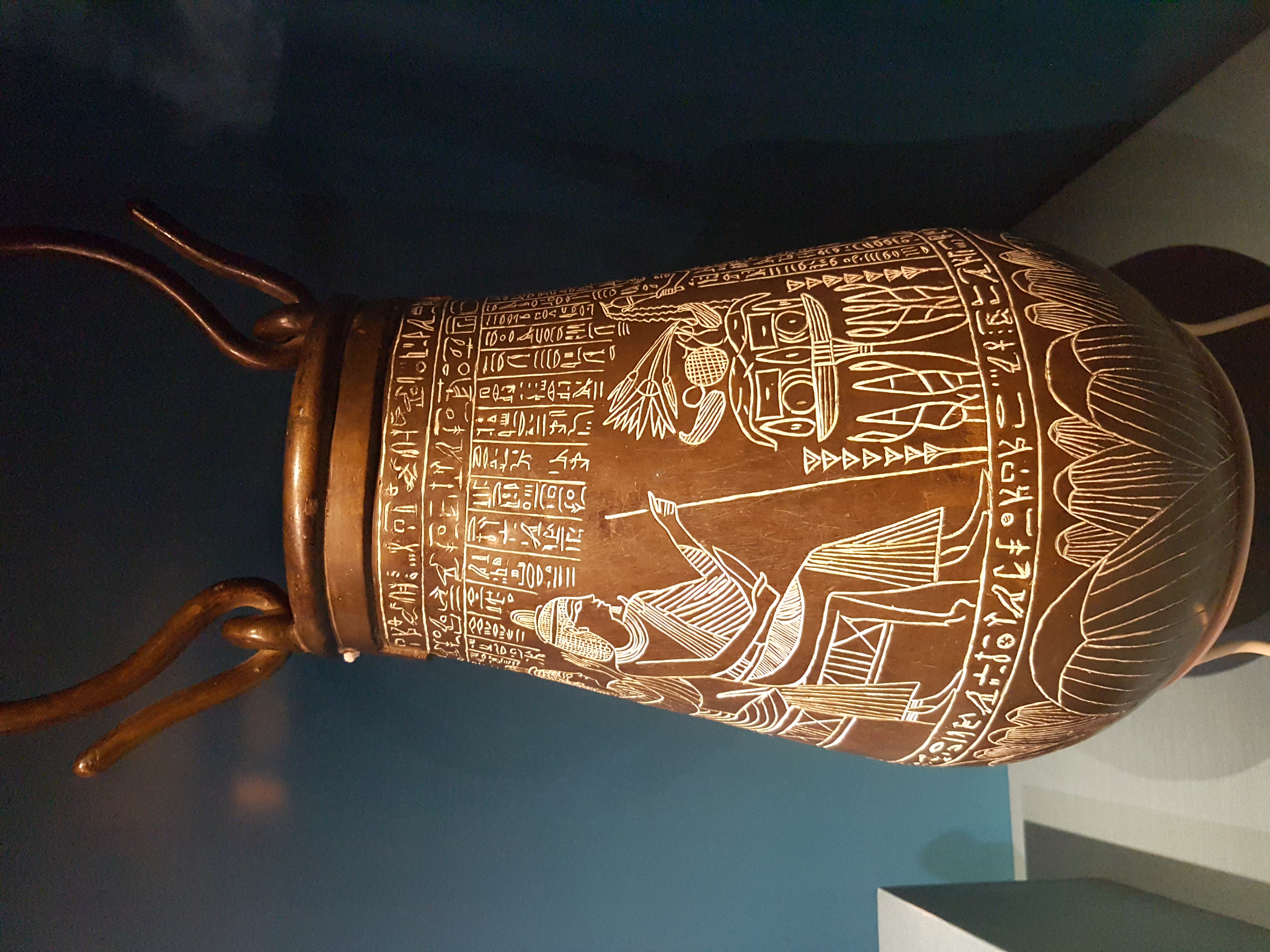 Situla of Hor, end of the Late Period to the beginning of the Ptolemaic Period, about 350-280 BCE. From Thebes, Egypt. The British Museum (photo taken at The Powerhouse Museum, Sydney, Australia). Situlae were important vessels used for libations to the gods and the deceased. This high quality situla belonged to a priest called Hor. He served several gods, including Amun, Mut and Khonsu. He is shown seated with his wife Keretj, while their son offers water and incense to the couple. The base of the vessel is decorated with a lotus flower, symbolising rebirth.