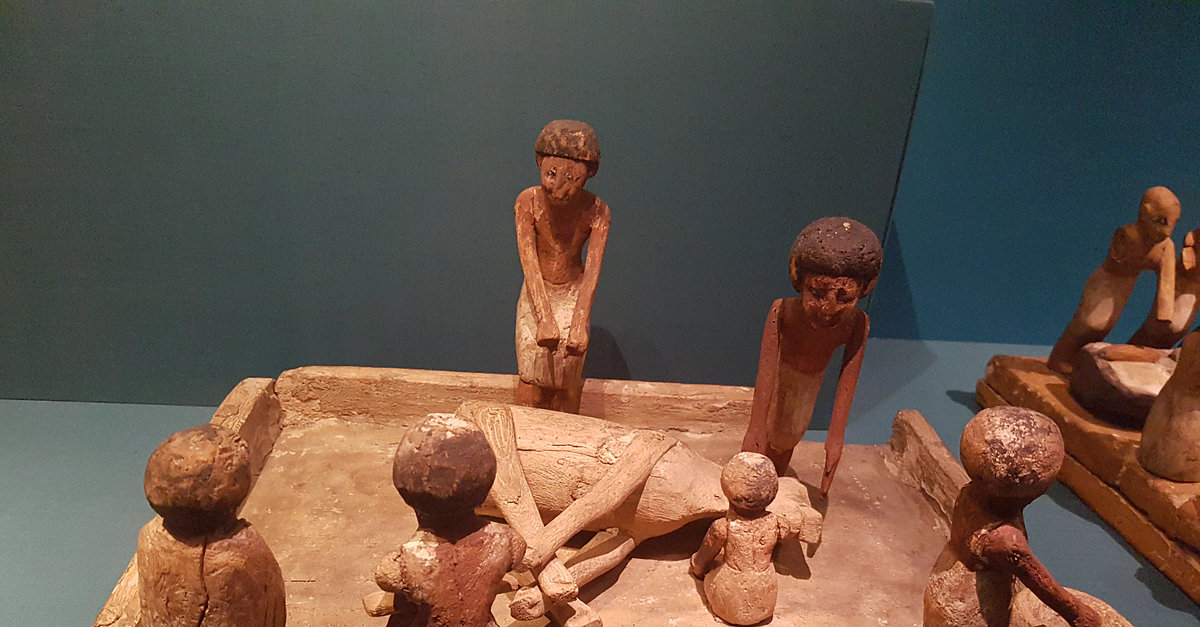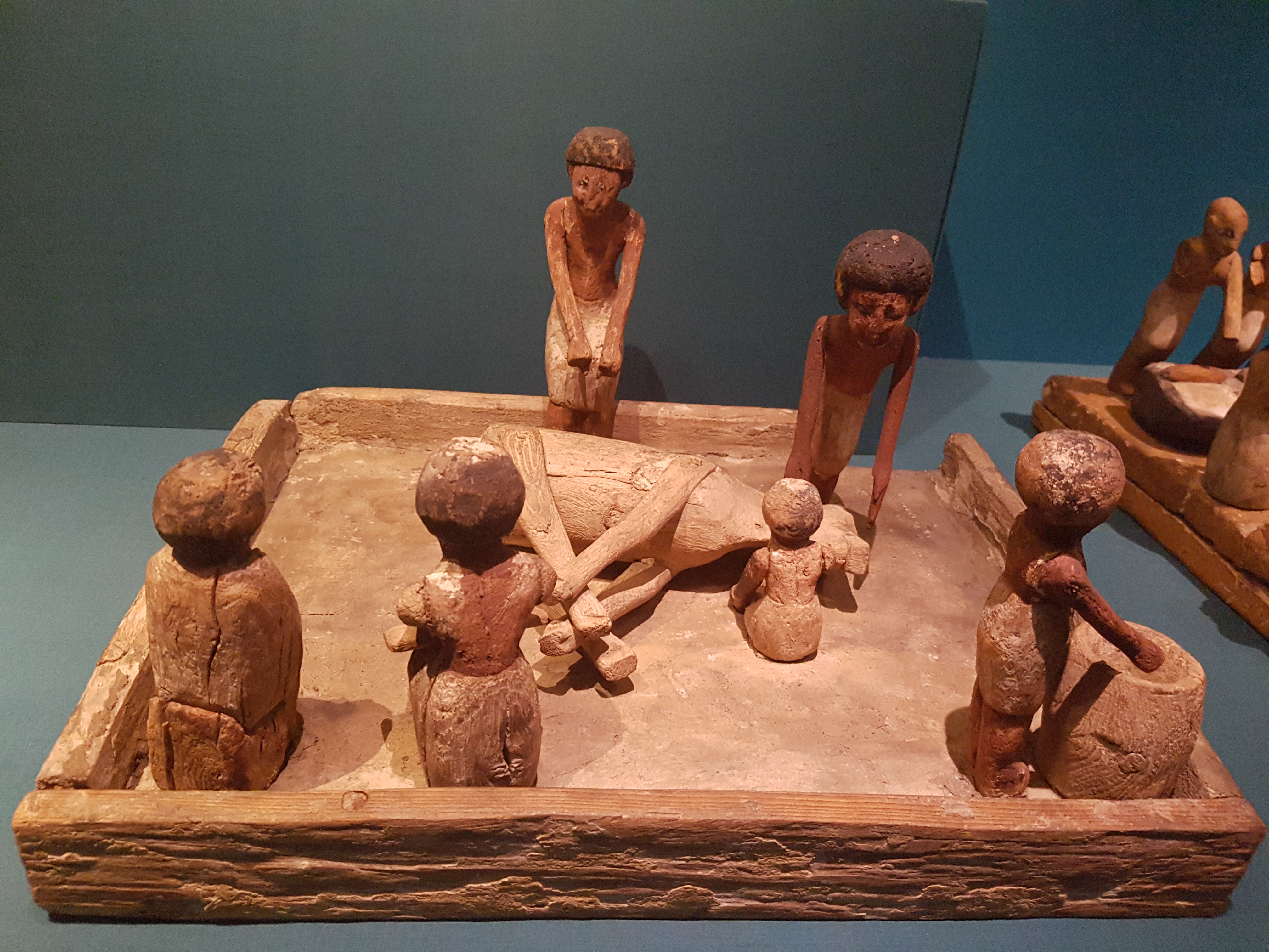 12th Dynasty, about 1985-1795 BCE. Provenance unknown. The British Museum, (photo taken at The Powerhouse Museum, Sydney, Australia) Wooden funerary model representing the slaughtering of a bull, enabling it to be sacrificed for eternity in the afterlife. Meat, in particular, the bull's foreleg, was a typical food offering.