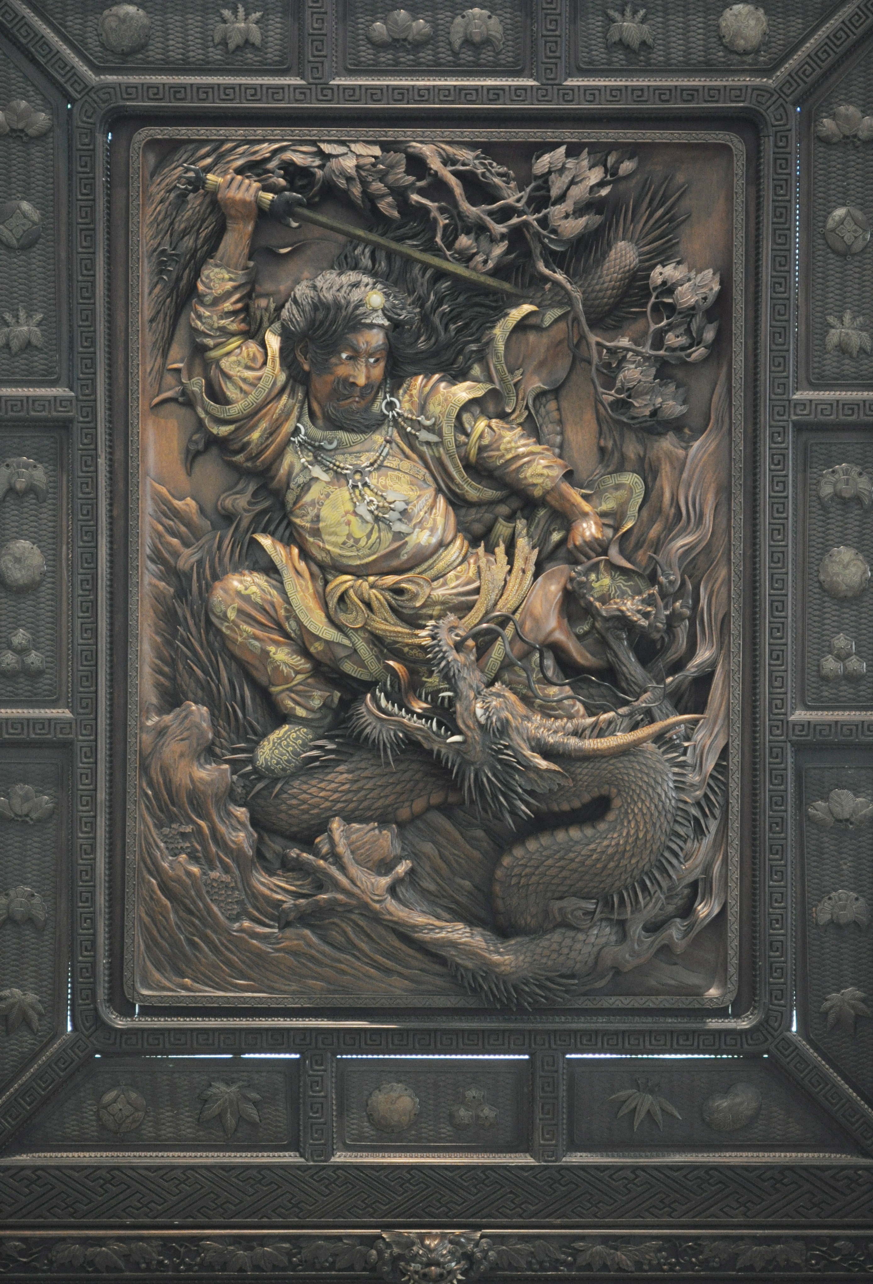 Wooden screen depicting the Shinto god Susanoo defeating the dragon with eight heads, 19th century. Susanoo was the god of storms and Yomi, the underworld.