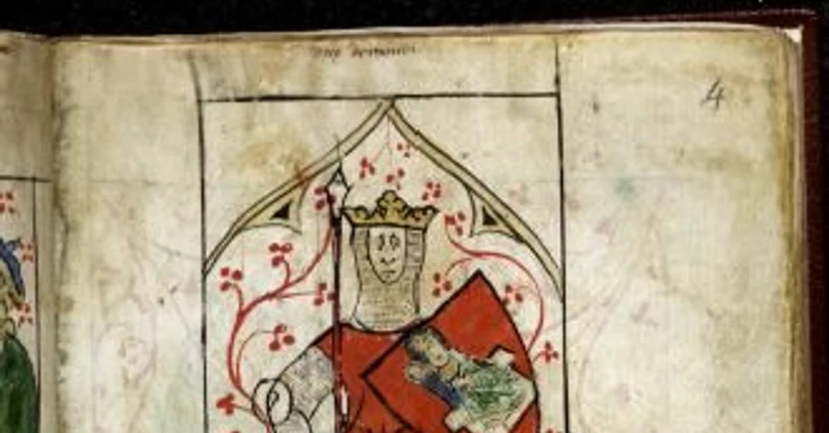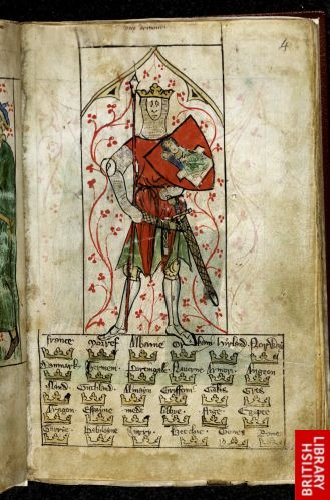 Miniature of King Arthur, holding a spear and a shield emblazoned with the Virgin and Child. 14th-century CE manuscript from England. Peter of Langtoft and others: Drawings with various inscriptions, distichs and poems (ff. 1-9v), verse lament of Edward II (ff. 10 r-v), Chronicle of England (ff. 11-146v) Lancelot du Lac, imperfect (ff. 147-152v), a letter purporting to be from Joanna, Queen of Sicily to Hugh IV King of Cyprus (ff. 152v-154), La Queste del Saint Graal (ff. 155-169v), the latter imperfect at the beginning and at the end British Library