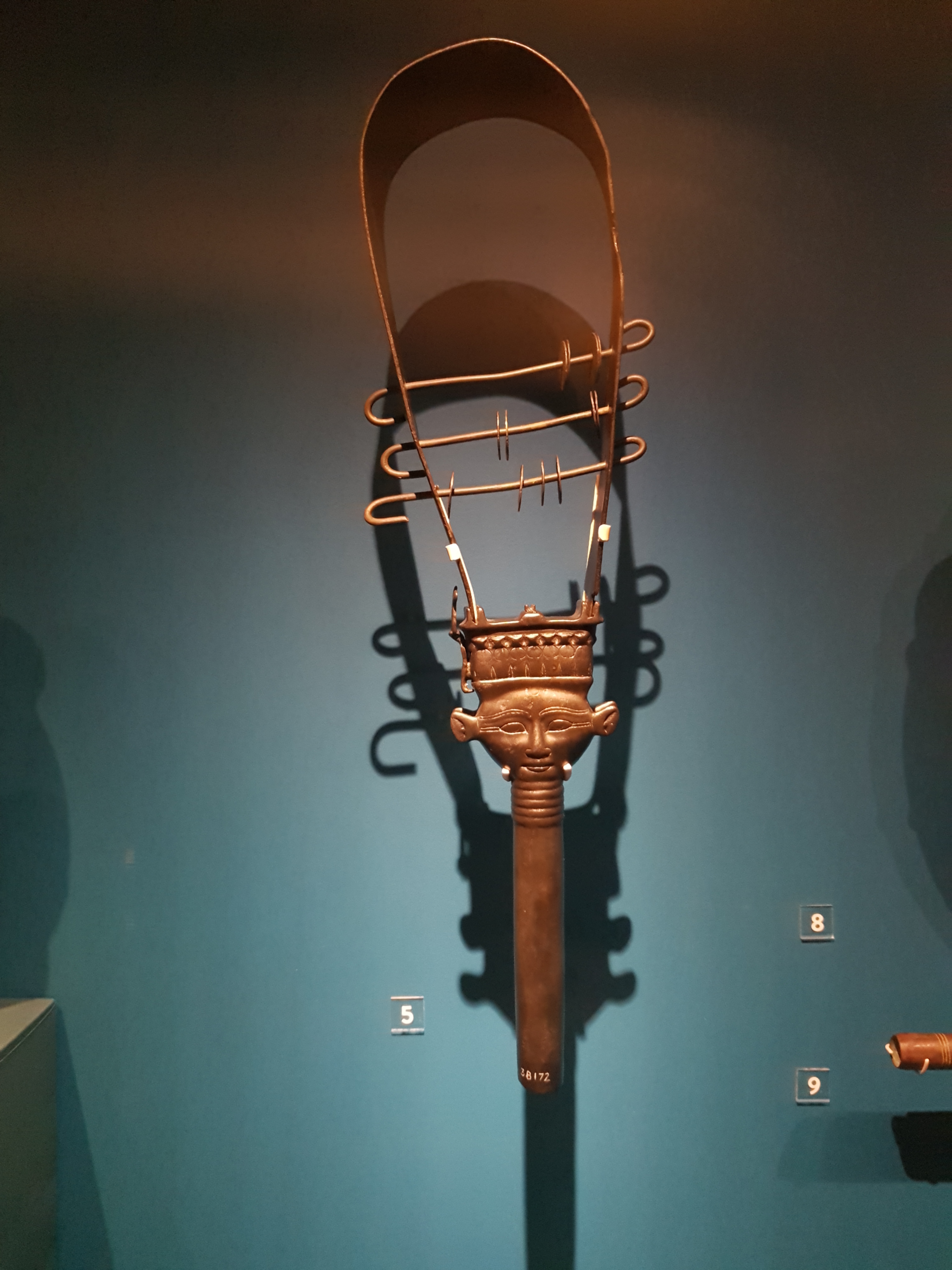 Egyptian bronze sistrum. Late Period, 664-332 BCE. Thebes, Egypt. From The British Museum, (photo taken at The Powerhouse Museum, Sydney, Australia) This sistrum is decorated with incised scenes, including the goddess Hathor with bovine ears. Such instruments were used by female musicians to accompany temple rituals.