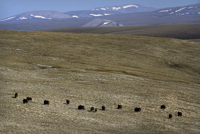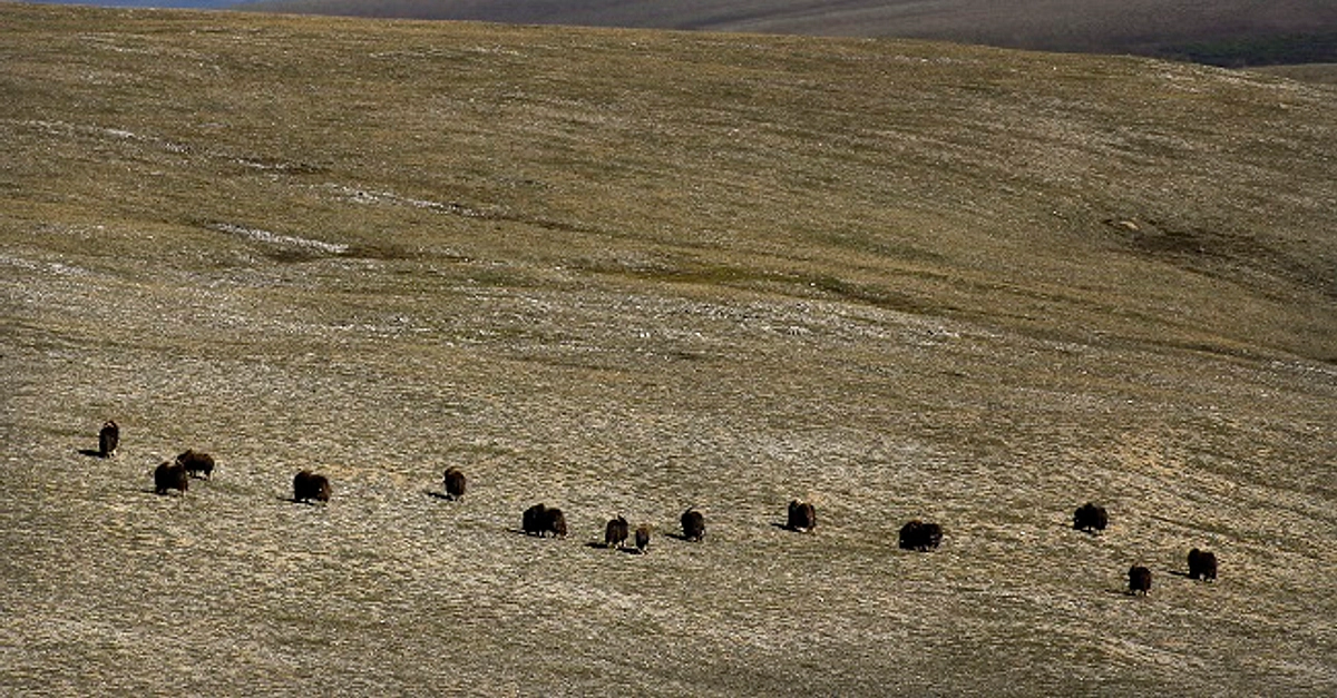 Muskox grazing on the tundra in Cape Krusenstern National Monument, northern Alaska. They have lived in northern Alaska since the Ice Age, once grazing alongside wooly mammoths and steppe bison. As the climate warmed, the muskox moved north and now are limited to Alaska, northern Canada and Greenland.