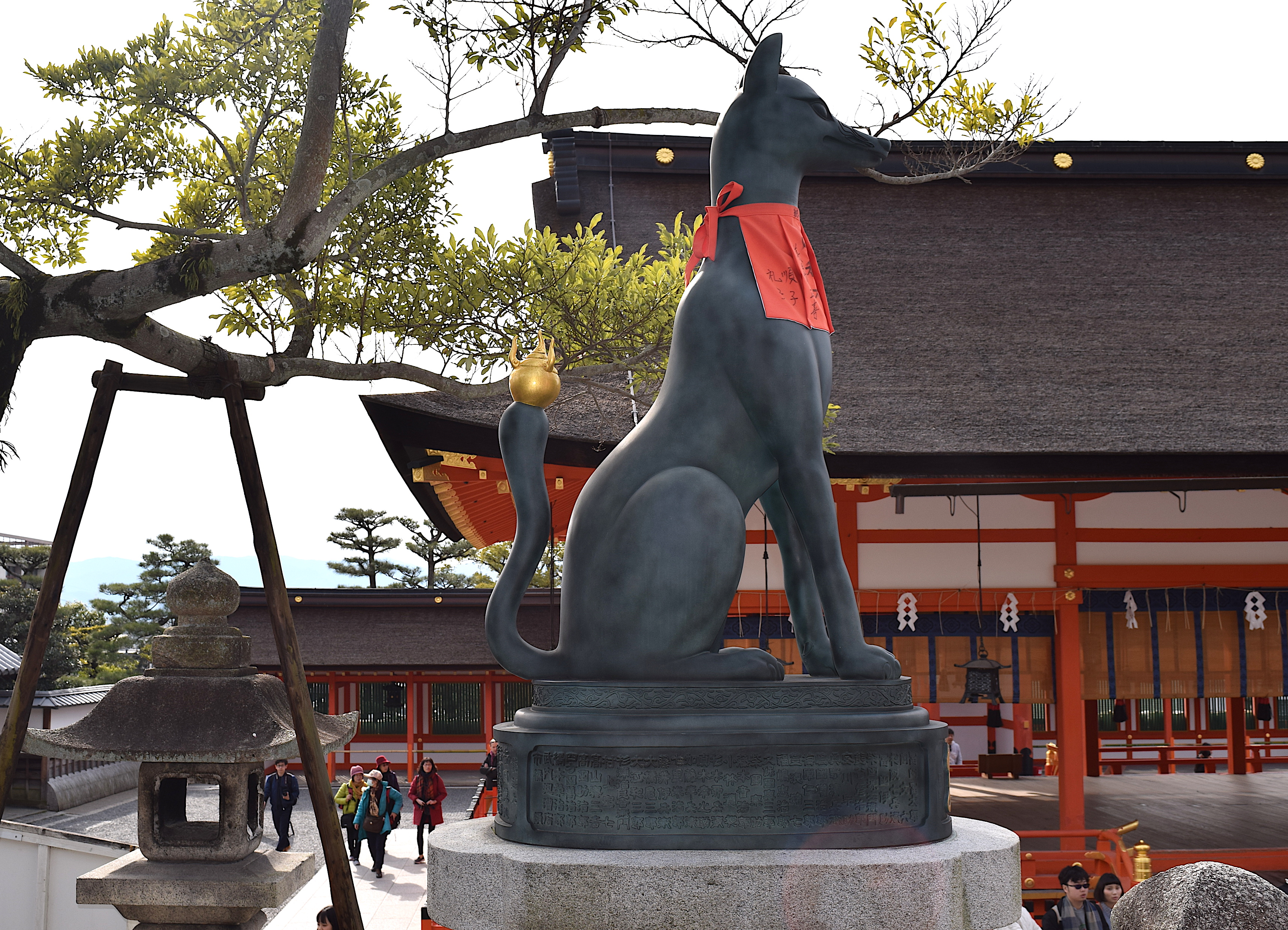 The Fushimi Inari Shrine near Kyoto (Heiankyo) is the largest and most important shrine dedicated to Inari, the Shinto god of rice and prosperity. It is famous for the large number of red gates (torii) at the site. The shrine was founded in 711 CE by the Hata clan and moved from its original location on Mt. Inari to its present location near Kyoto in the 9th century CE. In Shinto mythology the fox is Inari's vehicle and guardian. Consequently, the god's shrines may have many statues of foxes, often, like this example, wearing a red bib for good luck.