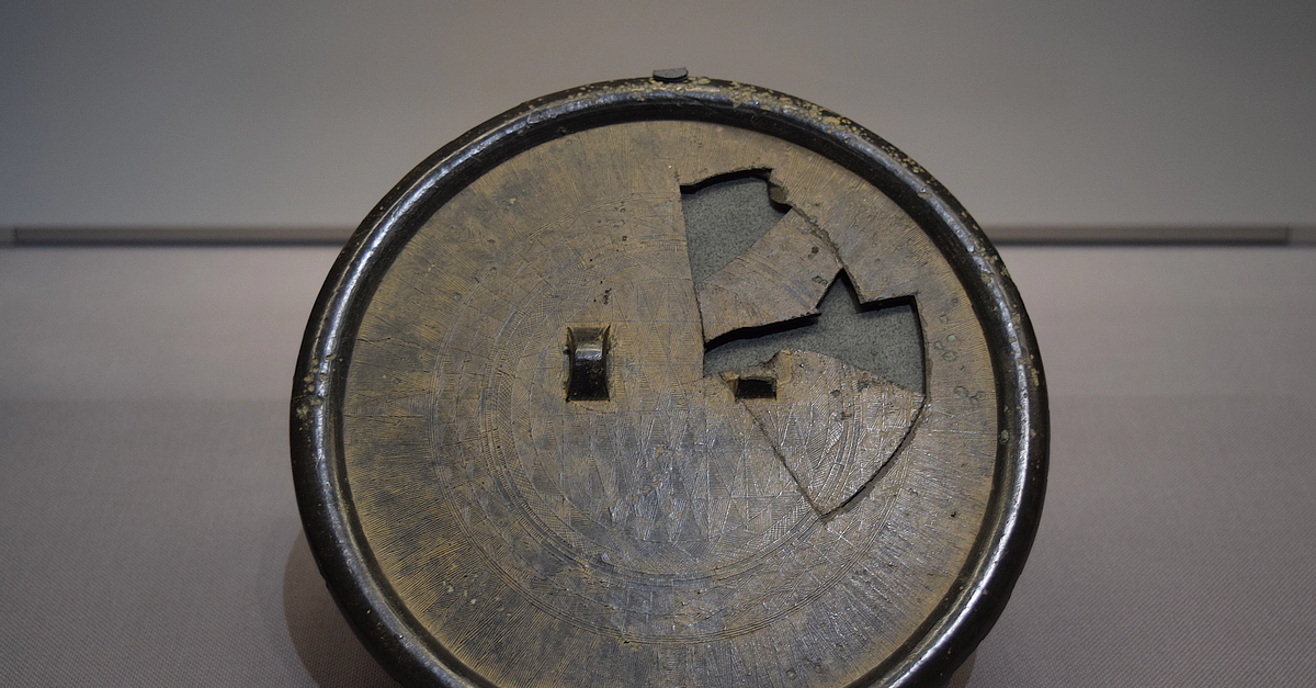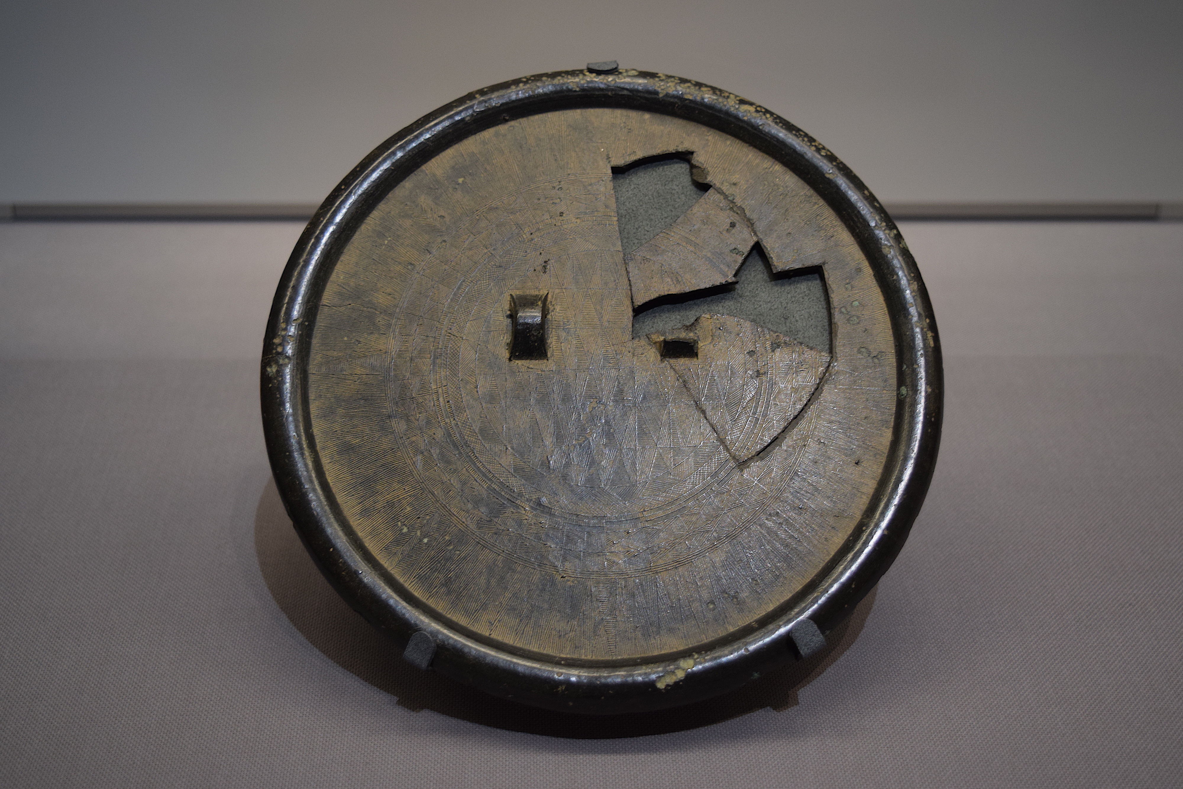 A Korean Bronze Age fine-line geometric mirror discovered at the Yayoi Period site of Ogata, Kashiwara-shi, Osaka, Japan. This specimen dates from the 4th-1st century BCE. (Tokyo National Museum)